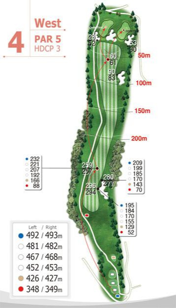 4번 파3 홀(블루티 194m. 화이트티 181m, 레드티 126m)에는 이 코스가 자랑하는 길이 100미터 연못의 바위 정원(Rock Garden)이 있다. 앞의 남코스 8번 홀 글에서 적은 ‘일본식 정원’ 홀이다. 길이가 주요 핸디캡이며 이 홀 연못도 심리적으로는 부담되지만 플레이에 큰 어려움을 주지는 않는다. 연못과 바위, 분재 형 반송으로 정성껏 조경된 연못에 비단잉어들이 노닌다.