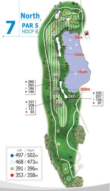 7번 파5 홀은 임상하 설계 특징을 잘 드러낸다. 페어웨이 오른쪽을 길게 따라가며 그린 앞까지 이어지는 호수가 플레이어의 전략과 도전, 힘과 기술 능력을 골고루 테스트한다. 장타자가 티샷을 잘 치면 투온에 도전할 수도 있겠다. 특히 오른 쪽 그린을 공략할 때 변별력이 높아진다. 이곳 지형을 활용하여 조화롭게 만든, 화려하지 않지만 참 유려한 홀이다.
