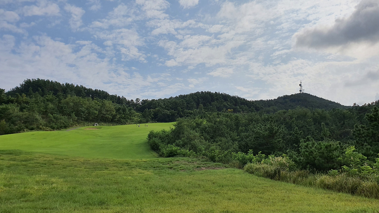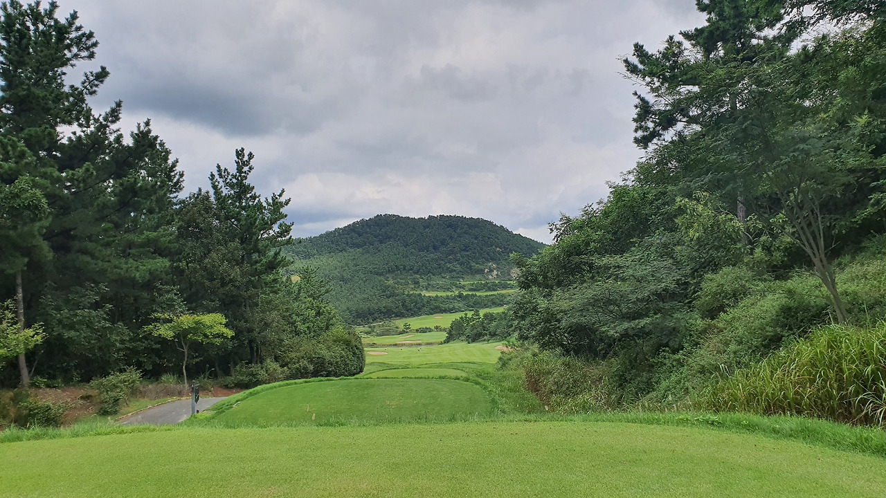 마운틴코스 6번 파4 홀티잉 구역에서 시야 가득히 갯벌 바다가 펼쳐지는 홀이다. 편안한 내리막의 짧은 파4 홀이며 페어웨이도 넓은 편이라 부담 없이 플레이할 수 있다. 그린이 2시 방향 타원이라 페이드샷으로 버디를 노려볼 만한 모양이다.
