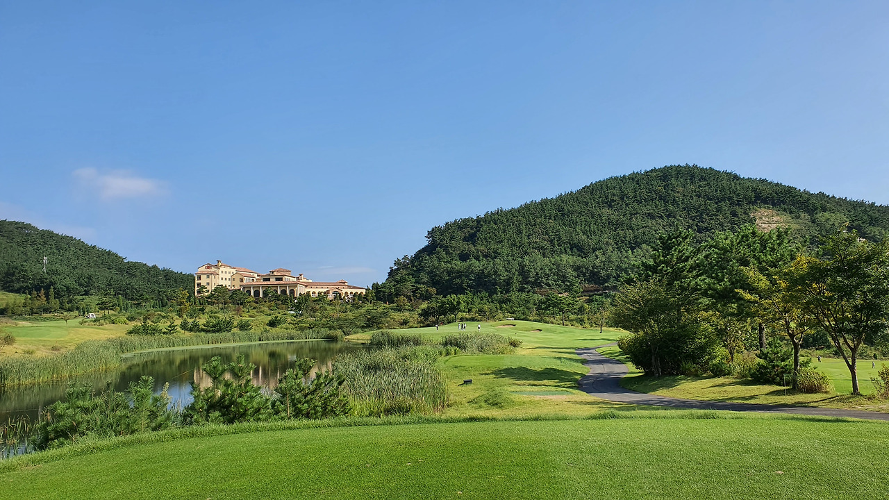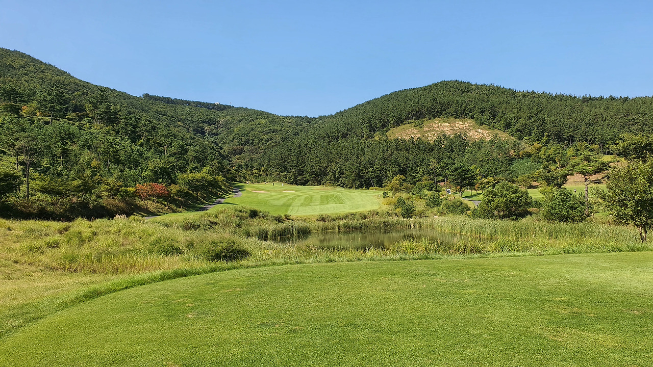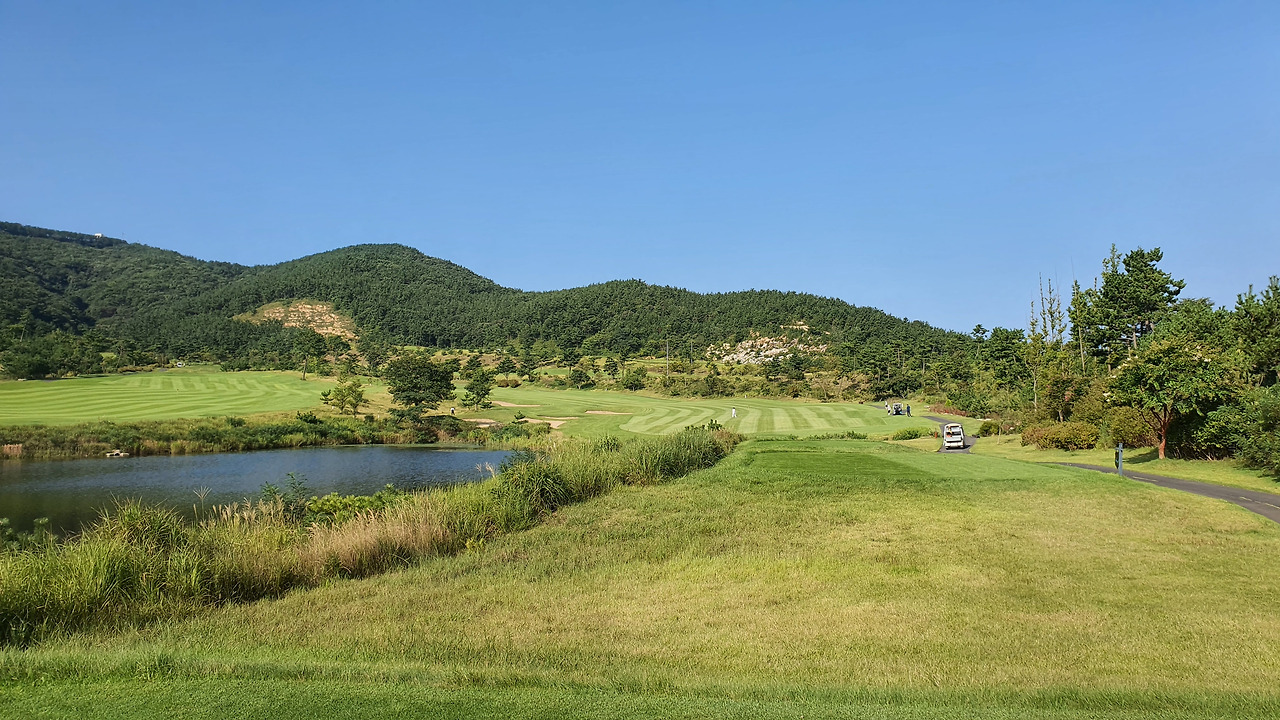 마운틴코스 9번 파5 홀천혜의 자연과 인공의 코스, 휴양지의 평화로움이 유장하게 어울린 홀이다. 갯벌바다를 향해 질주하듯 넓게 뻗은 페어웨이를 향해 마음껏 티샷할 수 있지만, 더 좋은 결과를 위해는 오른쪽 페어웨이 벙커를 넘길 필요가 있다. 지그재그형 페어웨이를 잘 이해하고 샷 방향을 잡고 랜딩지점의 선택해야 한다.