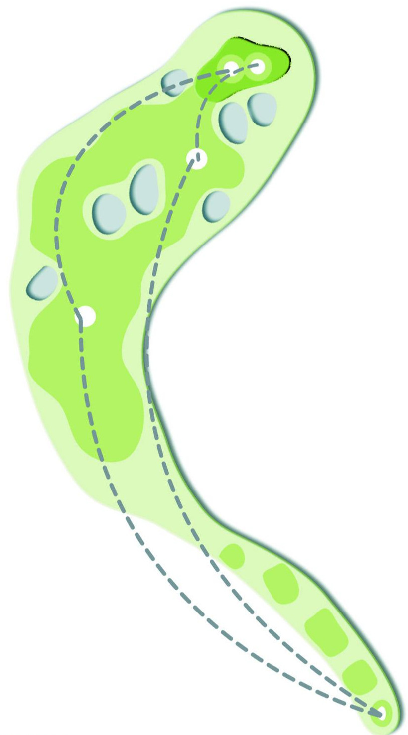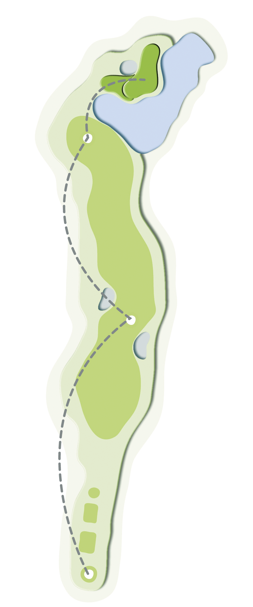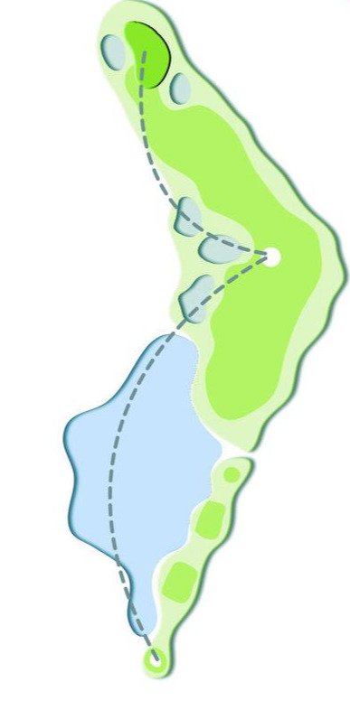 내리막이라 실제 플레이 거리가 짧은 파5 홀이라 장타자는 투온에 도전할 수 있으나, 그린은 커다란 호수 너머 아일랜드 모양이다. 티잉 구역에서 전략을 세우고 문제지 풀 듯 공략해 나가야 하며 티샷 결과에 따라 세컨샷 전략이 달라질 수 있다. 장타자에게 유리한 홀이지만 도전을 해야 보상이 있고 만용과 실수에는 응징이 있다. 이 코스의 핸디캡 1번 홀로 표시되어 있으나 레이업하여 자신 있는 거리의 어프로치를 선택한다면 자기 스코어를 지키기 어렵지 않다.
