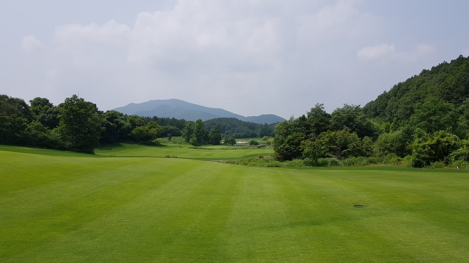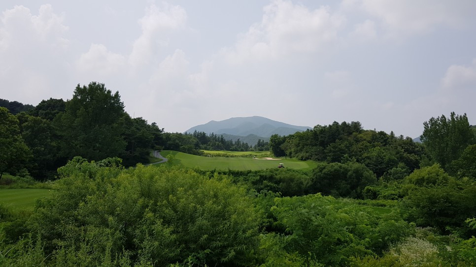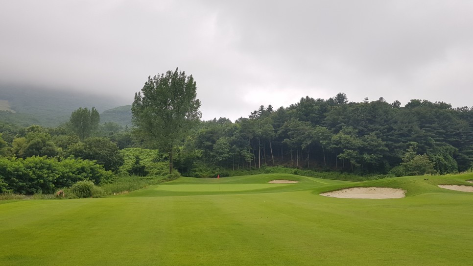 다만 살짝 솟아오른 그린 너머에는 나무들이 없었다면 더 좋지 않았을까 하는 생각도 듭니다. 그린 뒤편에 나무들이 없었다면 먼 산들이 구름처럼 겹능선을 이루는 시야가 확보되어 그린으로 다가설 때의 느낌이 더 인상적이었을 듯합니다.