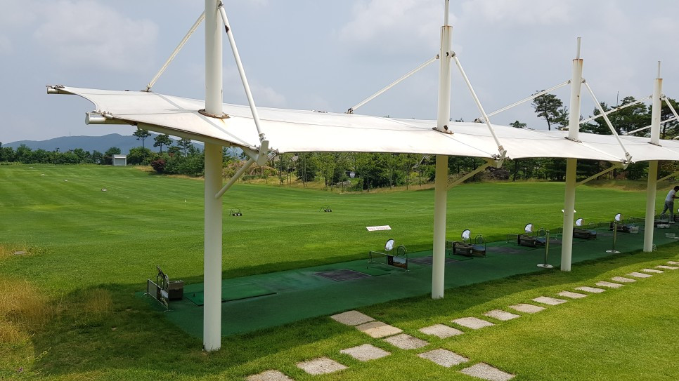 클럽하우스 앞에 설치된 연습장은 골프의 이샹향을 지으려 했던 열망이 잘 드러나는 시설입니다. 전장이 300야드, 20타석, 망이 설치되지 않은 켄터키블루그래스 푸른 잔디로 마음껏 칠 수 있는 드라이빙 레인지입니다. 볼 자판기에서 바구니에 볼을 받아 사용합니다.