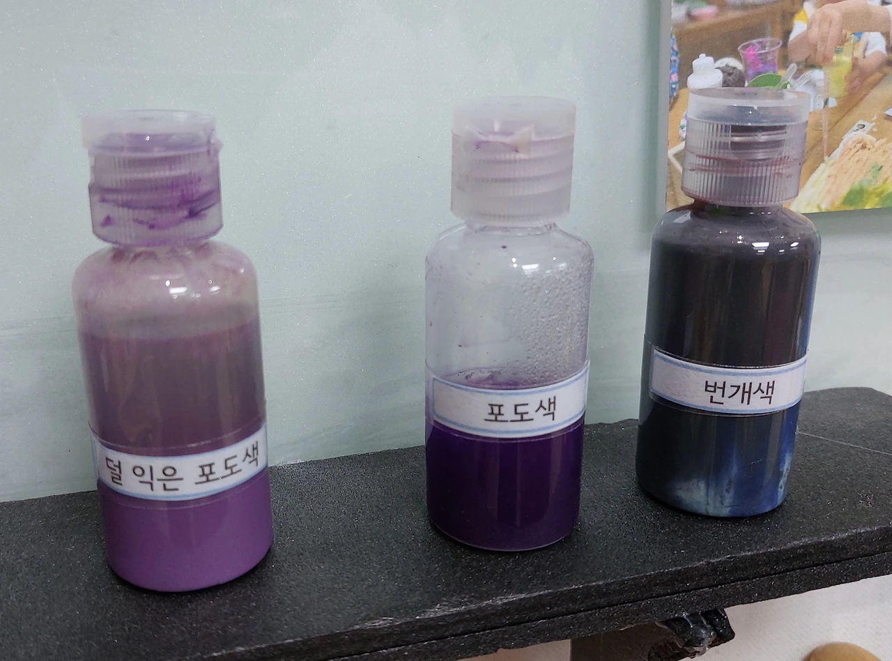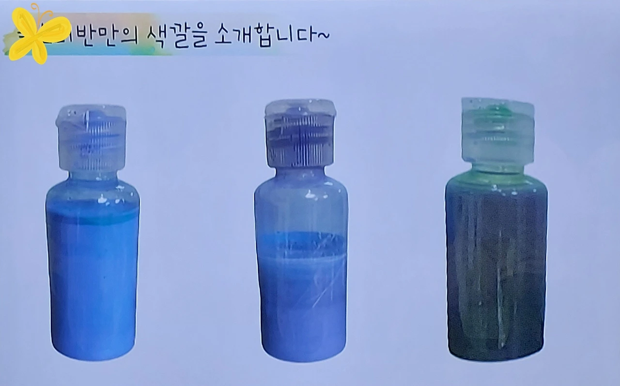 선생님은 지난 4개월간 아이들이 했던 활동들을 사진과 함께 설명해 주었다. 아이들이 꽃을 심고 개미를 관찰하고 소풍을 가고 등등. 그중 유난히 내 눈길을 끄는 PPT 페이지가 있었다. 아이들이 물감을 섞어서 만든 새로운 색에 이름을 붙여주었다며 보여준 페이지였다. 'ㅁㅁ반만의 색깔을 소개합니다'라는 글자와 함께 물병에 새로운 색깔의 물감이 담겨있는 사진이 있었다. 선생님이 질문했다.