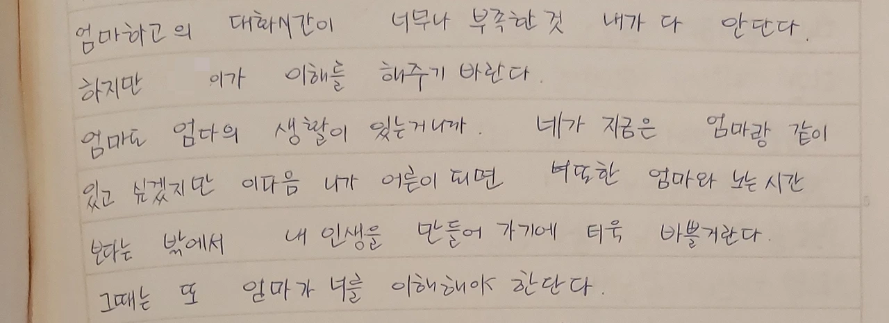 그리고 거기에 대해 나는 '엄마의 마음을 조금은 헤아릴 수 있을 것 같아.'라고 답했었다. 하지만 지금 생각해 보면 나는 그 당시에 엄마가 써준 글이 말이 별로 와닿지 않았다. 엄마의 마음을 그다지 헤아리지 못했다.