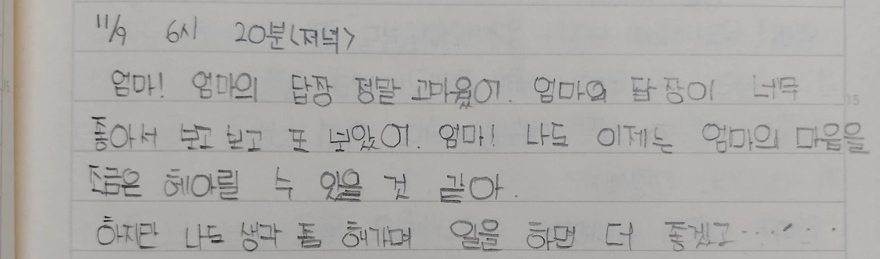 엄마는 다음날인 11월 9일 새벽 2시 35분에 답장을 써주었다.