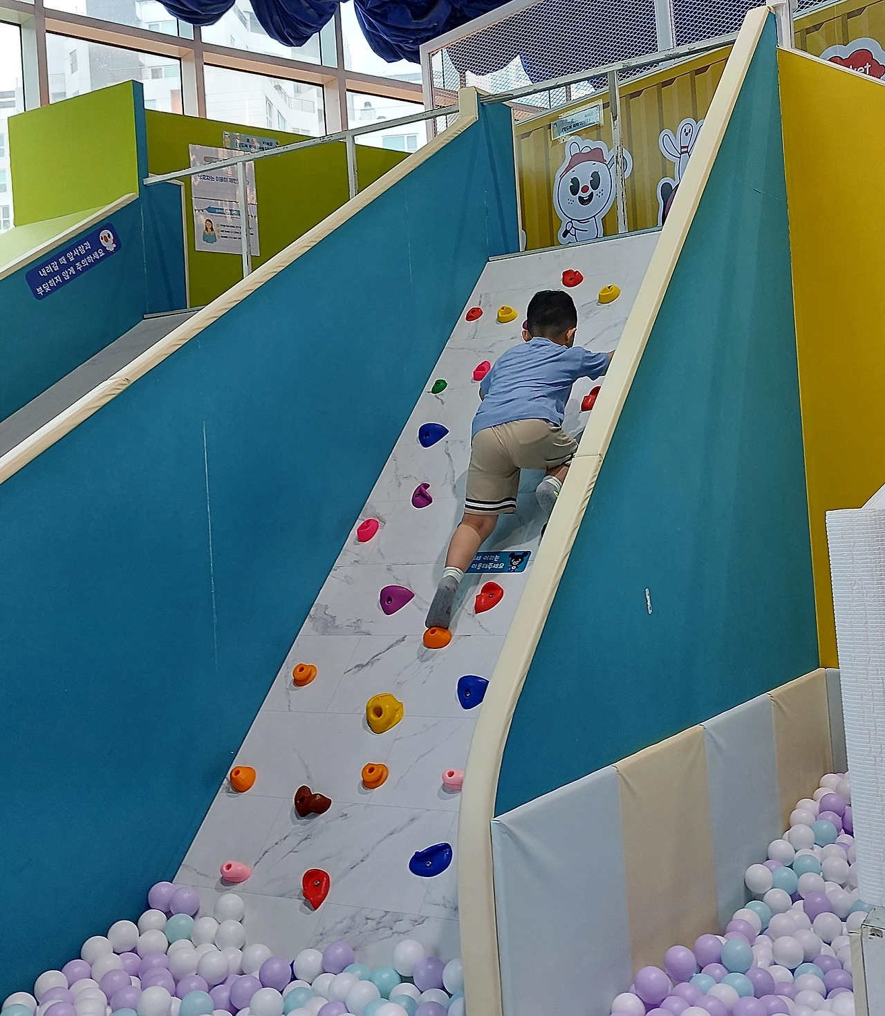 첫째 아이는 구슬 수영장 안에 있는 어린이용 암벽을 발견하더니 호기롭게 올라갔다. 2년 전만 해도 이런 암벽은 몇 발자국 올라가 보지도 못했었는데 이제는 우직해진 뒷모습을 보니 든든했다.