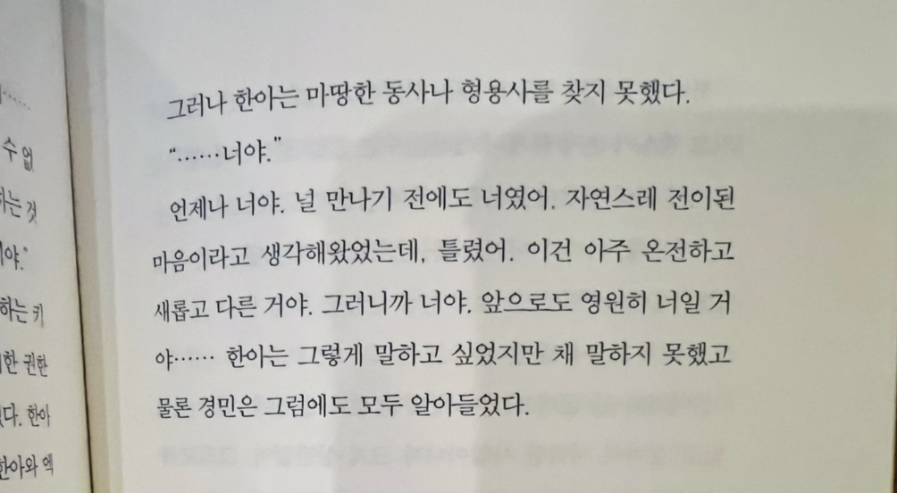 정세랑 작가의 『지구에서 한아뿐』을 읽었다. 아주 사랑스러운 로맨스, 환경 소설이었다. 이 작품을 읽고 확신이 들었다. 정세랑 작가의 작품은 뭘 읽어도 재밌을 거라는 확신. 책을 덮자마자 정세랑 작가의 소설을 여러 권 주문했다. 다 읽으면 또 주문할 계획이다. 정세랑 작가의 소설이 좋은 이유는 무엇보다 ‘재미’다. 어떤 사람도 정세랑의 소설을 읽고 ‘책은 따분하고 재미없어.’라고 말하지 못할 것이다. 그만큼 재미있다. 또 시대를 읽는 감각도 탁월하다. 동시대의 사회문제들을 서사에 적절하게 담는다. 인물들이 관습화 된 삶을 거부하는 것도 인상적이다. 그러면서도 다정함을 잃지 않는다. 다정하고 친절한 것을 좋아하는 작가님의 사려 깊은 마음이 묻어난다. 읽다 보면 나도 모르게 다정한 사람이 되고 싶어 진다.