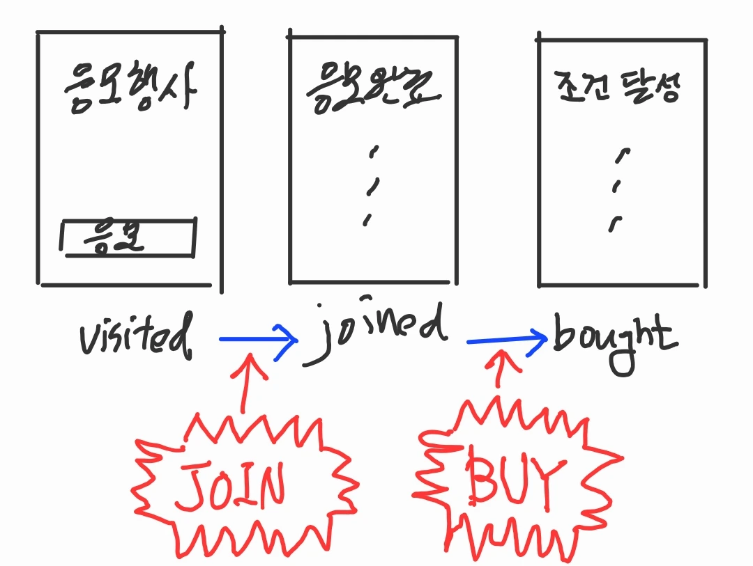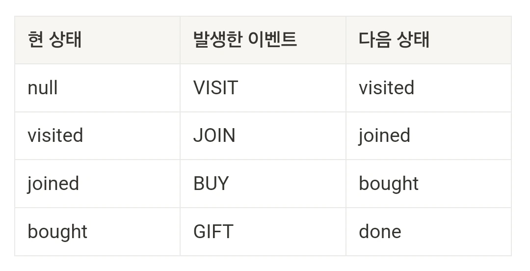 visited 상태에서 JOIN이 발생하면 joined상태로 전이되라는 설정인 거지. 근데 visited에서 시작하는 전이가 없는 VISIT이나 BUY이벤트는 발생해도 아무 일도 일어나지 않아.