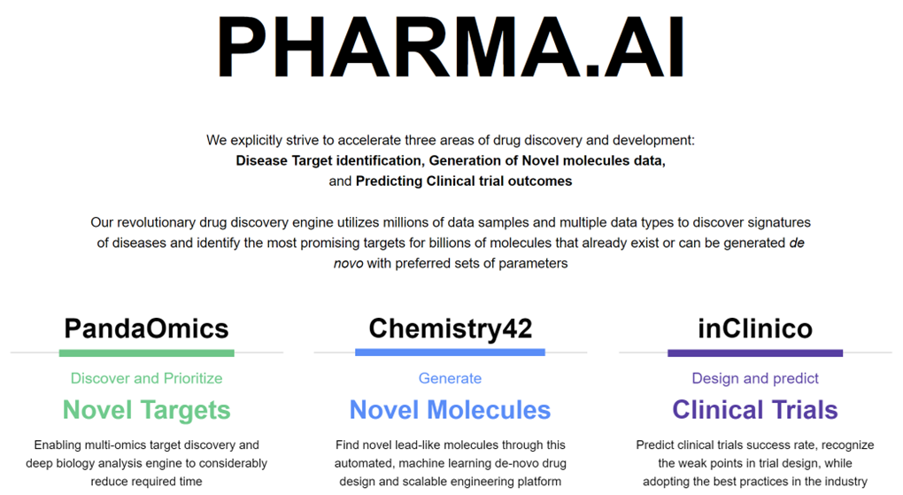PandaOmics는 다양한 오믹스 데이터(유전체학, 전사체학, 단백질체학 등)와 과학 문헌, 임상 기록 등을 통합 분석하여 질환의 발병 메커니즘과 새로운 약물 표적을 발견합니다. 이 플랫폼을 이용하여 Insilico Medicine은 TNIK라는 단백질을 특발성 폐섬유증(IPF)의 새로운 표적으로 발굴했습니다. 이후 이 표적을 기반으로 개발된 INS001-055는 전 임상 질환 모델에서 기존 치료제보다 우수한 항섬유화 및 항염증 효과를 보여주었고, 이 결과를 바탕으로 임상 개발에 들어가 성공적으로 임상 1상에서 약물의 안전성을 입증한데 이어 임상 2상 전기에서도 통계적으로 유의한 효능을 확보함으로써 AI가 발굴한 약물 표적을 대상으로 AI가 설계한 신약 후보물질 중 최초로 임상 시험에서 효능을 입증한 사례로 주목받고 있습니다.