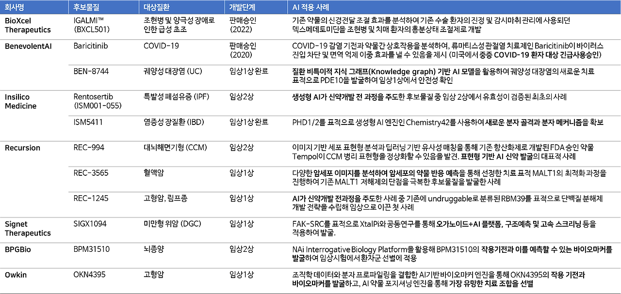이 이외에도 BenovolentAI, Recursion Pharmaceuticals 등의 AI 기반 신약회사들은 자체적으로 개발한 AI 모델을 활용하여 약물표적의 발굴 및 검증부터, 유효물질 발굴, 선도물질 최적화를 진행함으로써 전통적인 신약개발 방식보다 새로운 구조와 작용 메커니즘을 지닌 전 임상 후보물질들을 지속적으로 만들어내고 있습니다.