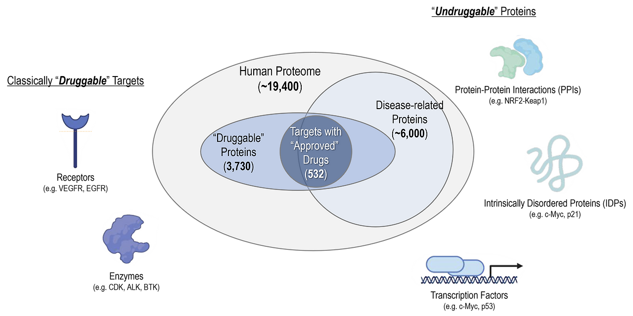 한때 '신약개발이 불가능하다'라고 여겨졌던 단백질들이 있습니다. 이들은 단백질의 구조가 너무 유연해서 형태가 계속 변하거나, 약물이 결합할 수 있는 포켓이 없어서 기존의 방식으로는 접근이 불가능했던 단백질들입니다. 우리는 이들을 'Undruggable Target'이라고 부릅니다. 인체 내 단백질의 85% 이상이 이 범주에 포함되며, 이로 인해 수많은 질환이 아직까지도 효과적인 치료법 없이 남겨져 있습니다.