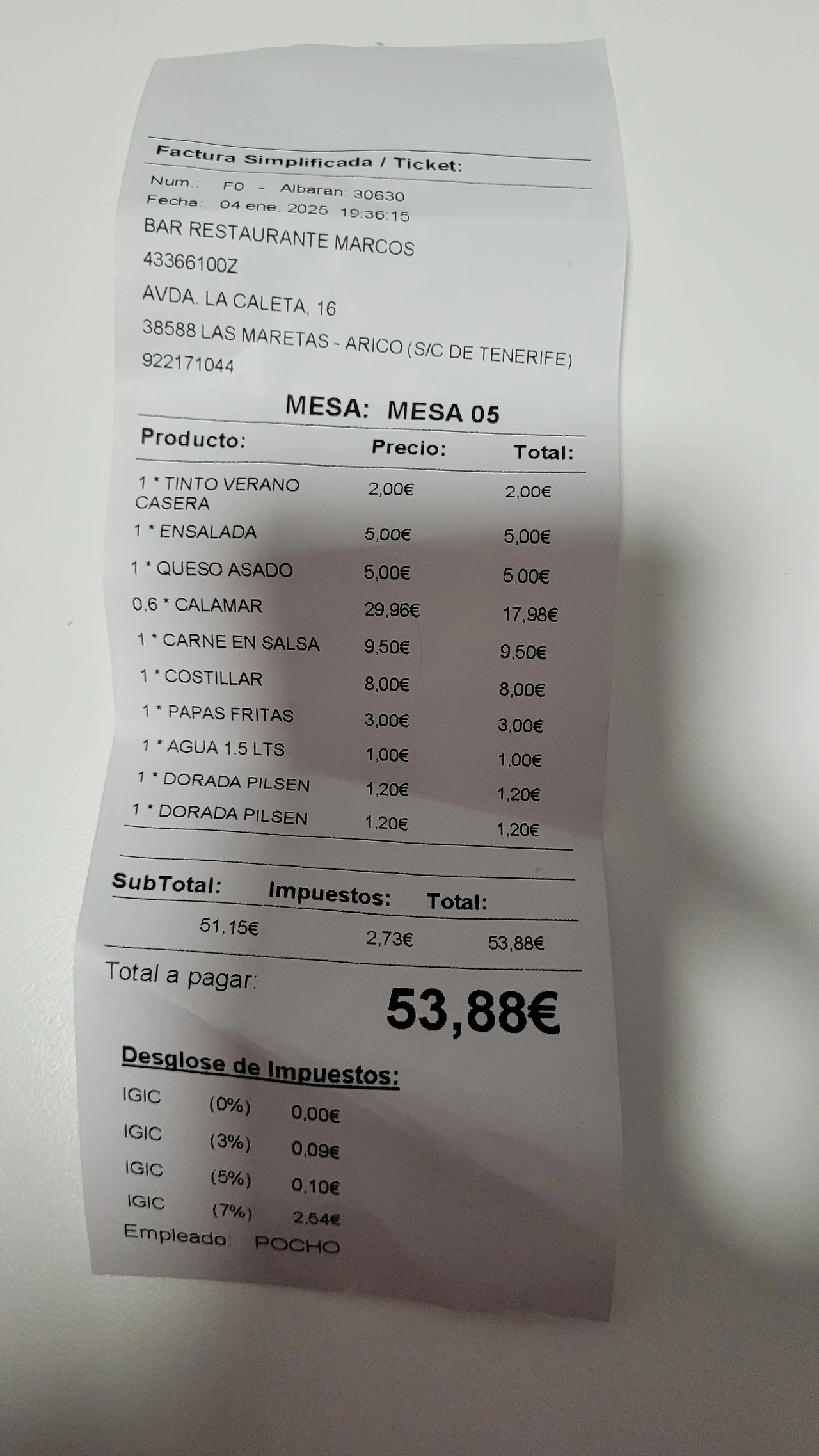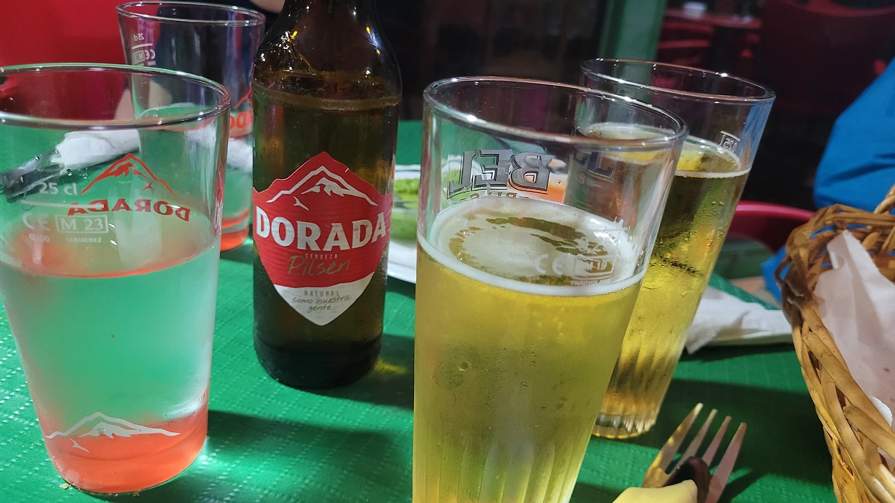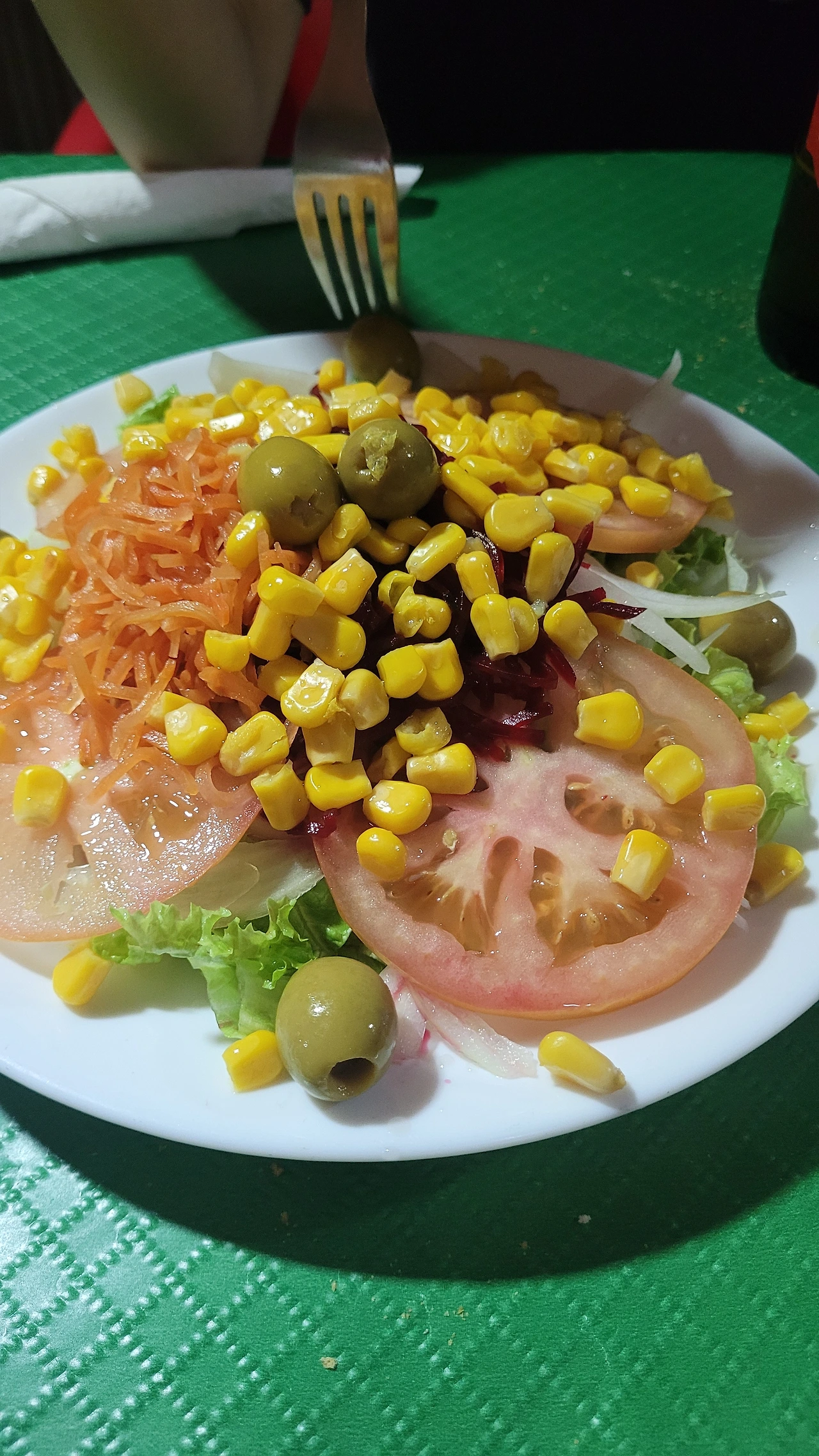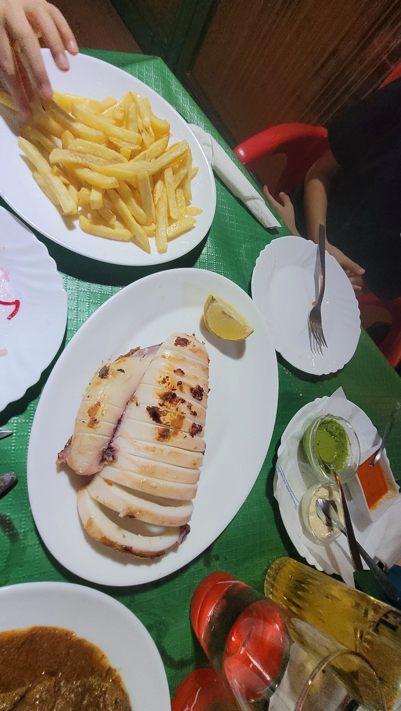 사진은 못 찍은 그릴요리가 수육과 비슷한 맛이었고, 아이들 때문에 시킨 오징어 (어딜 가나 오징어가 제일 비싸다), 양념된 소고기(비추. 너무 짜다) / 맥주 두 병과 샹그리아까지 해서 53유로.