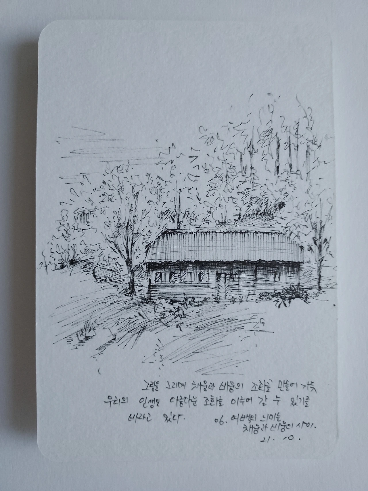 그림을 그리는 것은 빈 여백을 채우는 과정이라 생각하고 있다. 삶을 살아가는 것도 인생의 남은 여백을 채우는 과정이라 여긴다. 여백의 의미를 비워진 것에 두기보다는 채움과 비움의 사이라고 말하고 싶다. 누군가는 크게 채우고 누군가는 작게 채운다. 누군가는 꼼꼼히 채우고 누군가는 러프하게 채우기도 한다. 채움의 방식에 따라 비움이 달라진다. 항상 여유를 가지고 채움과 비움의 사이를 돌아봐야 좋은 그림이 나오고 좋은 인생을 살 수 있는 것 같다. ‘빨리’에 빠지면 채움과 비움, 그 사이가 적절한지 살펴볼 겨를이 없어져 버린다. 빨리와 안 된다가 짝꿍이 되어 못 하겠다고 하라고 속삭인다. 그럴 때마다 빨리 안 되는 것은 속도를 의미하지 하기 싫은 이유가 되지 않는다는 것을 명심하고 있어야 한다. 일상을 그리는 산발쌤 이야기가 7편에서 더 진행되지 않았지만, 완전히 끝낸 것은 아니다. 여유를 갖고 많이 채워볼 생각이다. 자주 경험해 보겠다는 것이다. 내 여백에 산발쌤 자리가 여전히 있다. 다만, 여유를 가지니 급할 게 없다. 언제든 채워 나가면 된다. 에피소드만 적어 놓은 글도 있고, 손으로 스케치해둔 것도 있다. 이런 스타일의 그림도 좋다는 분들을 위해서 산발쌤만큼은 꼭 디지털 드로잉으로 작업하고 싶은 마음에 남겨두었다.