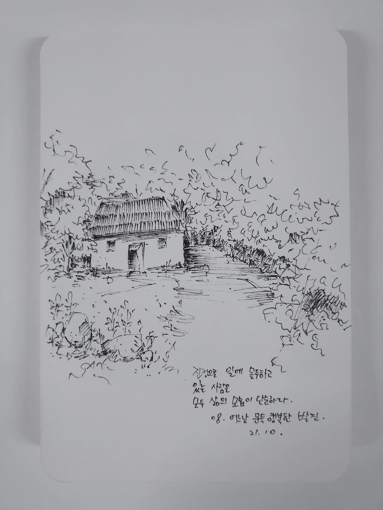 장미로 인해 받은 감정은 많지만, 그것을 상기시키기 전에는 어떤 표현을 하면 좋을 것인가란 미궁 속에서 빠져나오지 못한다. 소박할지라도 나의 것이 창작활동의 시작이 된다. 창작자에게 창작활동을 하게끔 영감을 줄 수 있는 것을 행복한 발견이라고 하고 싶다. 기쁘고 좋은 것만이 아니라 슬프고 고독하고 두려운 감정도 표현할 거리를 찾는 창작자에겐 행복한 발견되는 것 같다. 이런 발견은 어느 날 문득 이루어지는 경우가 많다. 나는 책을 읽으면서 간접적인 것에 대해 상상하게 되는 경우와 일상에서 직접 경험한 것에서 깨닫게 되는 경우가 많은 것 같다. 놓치지 않고 바로 실행에 옮기면 제일 좋지만, 더 매진하고 있는 게 있거나 지금 상황에 만족할 일이 있으면 다음으로 미뤄지기 마련이다. 그러다 작품에 대한 시린 날이 찾아와 마음을 지치게 한다면 도움이 필요하다. 내게 톨스토이의 시와 스케치와 메모들이 도움을 주는 것처럼 말이다. 제자리를 지키면서 행복한 발견을 찾아 몰두할 수 있도록 하는 대상이 누구에게나 있다고 생각한다. 제자리를 지킨다는 건 안정감을 줄 것이고, 나의 발견에 몰두하는 건 욕심 대신 진심을 들여다볼 수 있는 계기가 되어 줄 것이다.
