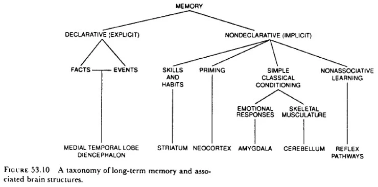 절차적 기억 (SKILLS AND HABITS ; Precedural memory) - 자전거를 타는 방법, 걷는 방법 등 기억하고 있다는 사실조차 의식하거나 설명하지 못하는 말 그대로 '몸에 익은' 기억.