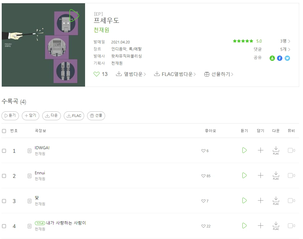 앨범 제목 [프세우도]는 영단어 pseudo를 보이는 대로, 그러니까 잘못 읽은 음성의 전사이다. 여기서의 pseudo는 '유사'과학의 그 '유사'이며, '수도 코드(psuedo code)'할 때 그 '수도'이기에 [수도]라고 읽어햐 하는 그 단어임을 밝힌다. 어떤 진실의 모조가 '수도'라면, 수도의 모조는 '프세우도'이다. 노래를 다 만들고 나서 처음 든 감상이었다. 모조의 모조같아 보일 정도로 서툴고 잘못 투성이인 것이다.