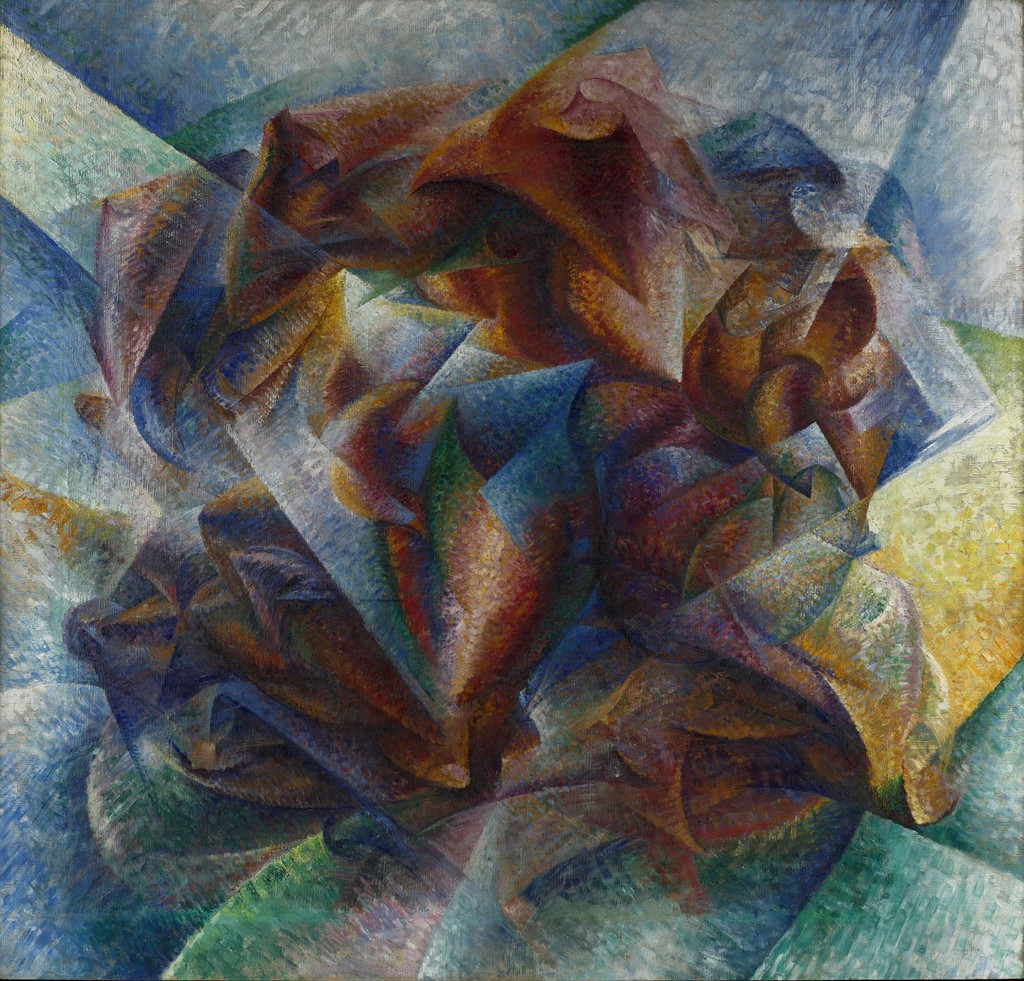 미래파 화가들은 1912년 파리로 여행을 하다가 프랑스 큐비스트(Cubists)들과 조우합니다. 이들은 곧 큐비스트의 작업을 자신의 것으로 흡수합니다. 보치오니는 파블로 피카소, 조르주 브라크 그리고 후기 인상주의자인 폴 세잔의 기법인 파사주-작은 조각 형상과 패치워크를 조합하는 기술-를 그들의 기법으로 차용합니다. 밀라노로 돌아온 보치오니가 완성한 <축구 선수의 역동성(Dynamism of a Soccer Player (1913)>에는 초기에 그가 빠져 있었던 모호성과 파편성이 잘 드러나 있습니다. 이 작품은 힘과 동작에 중점을 둔 추상적 표현이 도드라집니다. 이러한 스타일은 후에 미래파의 작업 기반이 됩니다.