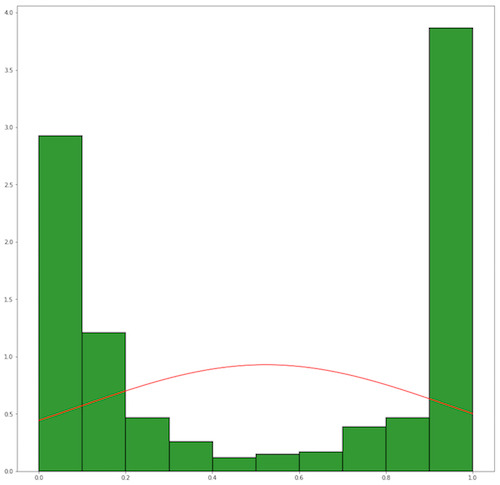 워스트 케이스(위). 학습 결과가 0.5 근방에 몰려있기 때문에 모델이 분류를 제대로 수행하지 못하고 있음을 알 수 있다. 반대로 베스트 케이스(아래)는 결과 누적 분포도가 0과 1 사이에 몰려 있다. 모델이 분류를 잘 수행하고 있다는 소리다. 좋다.