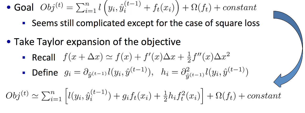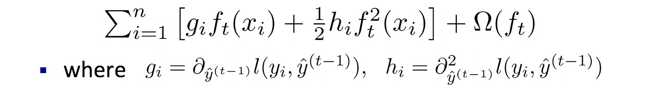 다음과 같이 미분 형태의 계산만으로 로스 함수를 재정의 할 수 있다. 여기서 함수 g와 h는 t 시점보다 작은 형태(t-1 시점)의 미분이므로, 무한히 전개했을 때 convergence 하는 형태를 찾을 수 있다. xgboost는 g와 h에 대한 모든 근사식을 사용자가 정의할 수 있고, 기본적으로 테일러 전개 선형 근사식을 사용하여 분산 처리하기 좋은 형태로 함수를 분리한다.