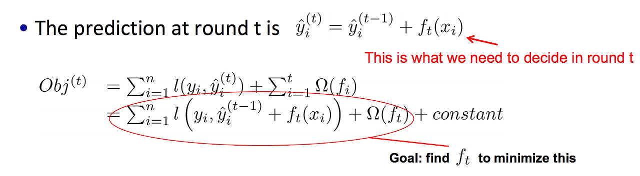 이때 빨간 원이 들어간 부분이 t-1 라운드의 loss가 된다. 즉, t 라운드의 문제가 t-1 라운드 문제로 달라졌다. 이제 이것을 <테일러급수 전개>를 사용하여 목적 함수를 근사하자. 테일러급수 전개는 이 식의 레지듀얼 폼을 일반화하기 좋은 형태로 마사지하기 위함이다. 이론적으로는 테일러급수 전개와 본래 함수가 차이가 없게 수렴하기 때문이고, 엔지니어링적 관점에서는 구조적이라 컴퓨터가 계산하기 좋게 뽀갤(?) 수 있다.