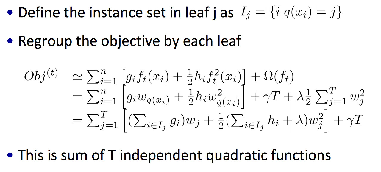 라고 정의했는데, 이것은 논문의 아이디어다. 즉, 최적의 복잡도 계산 방식은 개선의 여지가 있다. 결국 리프 스코어(L2 norm of leaves wight)와 리프 갯수(gamma)가 모델(f_t)의 복잡도를 결정함을 알 수 있다. 이제 모든 아이디어를 목적 함수에 적용하고, 이것을 weights 기준으로 정렬하면,