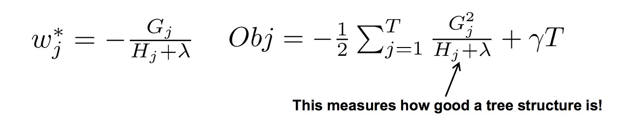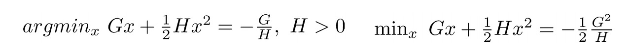 다음과 같다. 이제 수식을 축약하자. Sum of g는 G로, Sum of h는 H로. 그러면 목적 함수에 대하여 최적의 비중(weight) w*와 목적함수의 최적 값은,