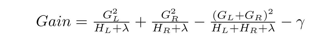 아래 수식에서 L은 Left side children score이고, R은 Right side children score다. 특정 depth에서 가지를 친다고 했을 때 정보 획득량 Gain은,