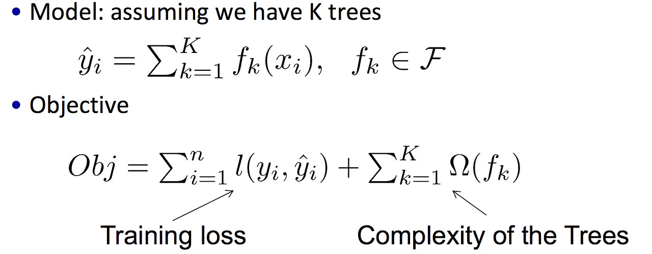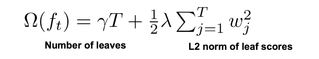 상단 수식에 있는 오메가 폼은 트리의 비중(weights)을 조절하는 조정 함수다. xgboost는 오메가 폼을