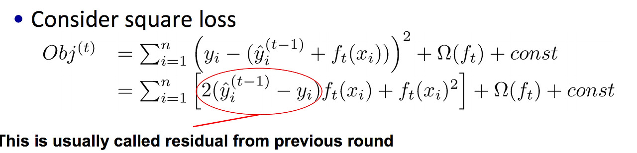 앞서 부스팅이란, 라운드가 지날수록(t) 모델의 에러를 줄이는 과정이라 설명했다. 즉, 목적 함수에서 로스 펑션(Loss function)을 t=1이 될 때까지 전개할 수 있다. 간단한 이해를 위해, 유저가 Square loss로 정의했다고 가정하자.