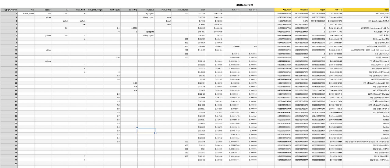 다시 한번 말하지만 파라메터 조정 우선순위는 사용자가 임의로 결정하는 부분이다. 아주 간단하게 모든 옵션 대비 for loop을 돌려도 될 것이다. 참고 삼아 이야기하자면, xgboost 디폴트 옵션과 필자가 찾은 베스트 파라메터의 Accuracy(F1-Score)는 각각 0.52(F1: 0.02) / 0.91(F1: 0.907)이다. 차이가 제법 난다.