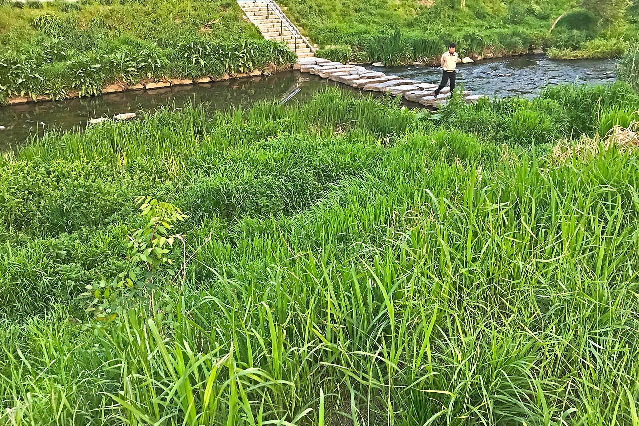 낯선 목소리에 아이들은 한껏 끌어안은 자전거를 내려놓고 저를 바라봅니다. 한 아이는 단발에 핑크색 뿔테 안경을 썼습니다. 다른 아이는 빨간색 뿔테 안경을 끼고 머리를 묶었습니다. 초등학교 저학년으로 보입니다. 둘은 제안을 듣더니 자리에 서서 눈빛을 교환합니다. 눈빛으로 짐작건대 둘은 친구 같습니다. 먼저, 핑크색 뿔테를 한 아이가 자전거를 건넵니다. 저는 그것을 들고 디딤돌을 밟습니다. 아이를 앞세워 자전거 한 대를 옮기고 다른 친구의 자전거를 들어 시냇가를 건넙니다.