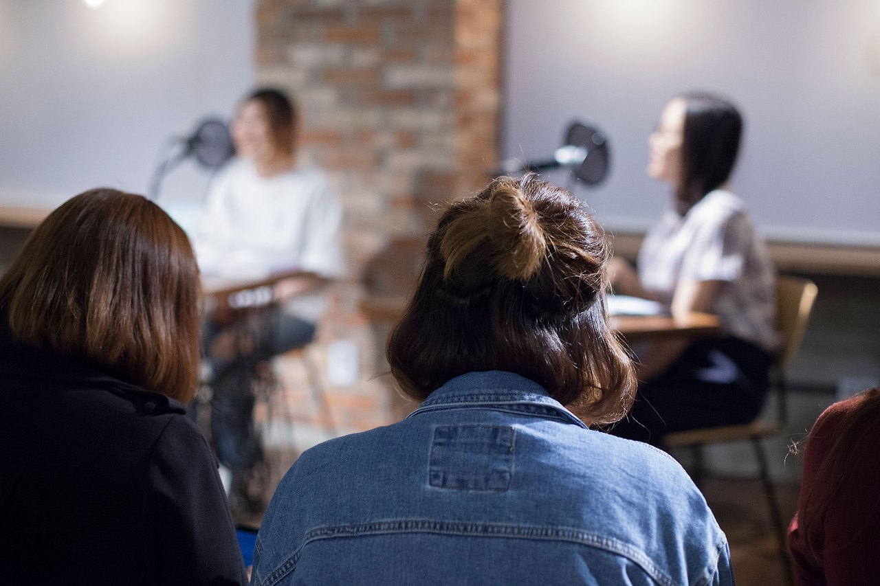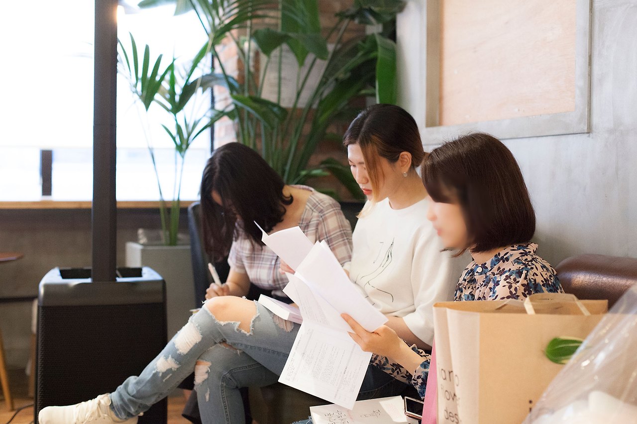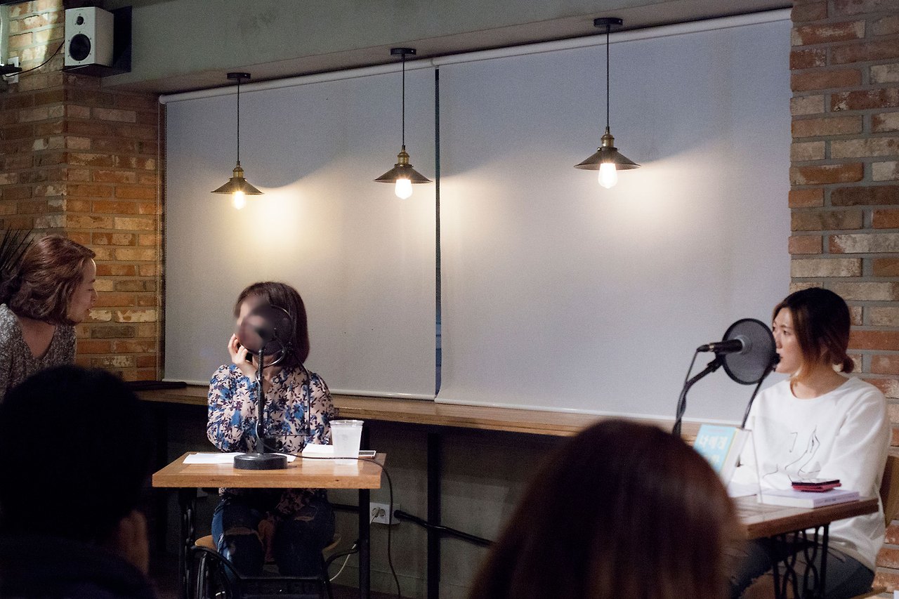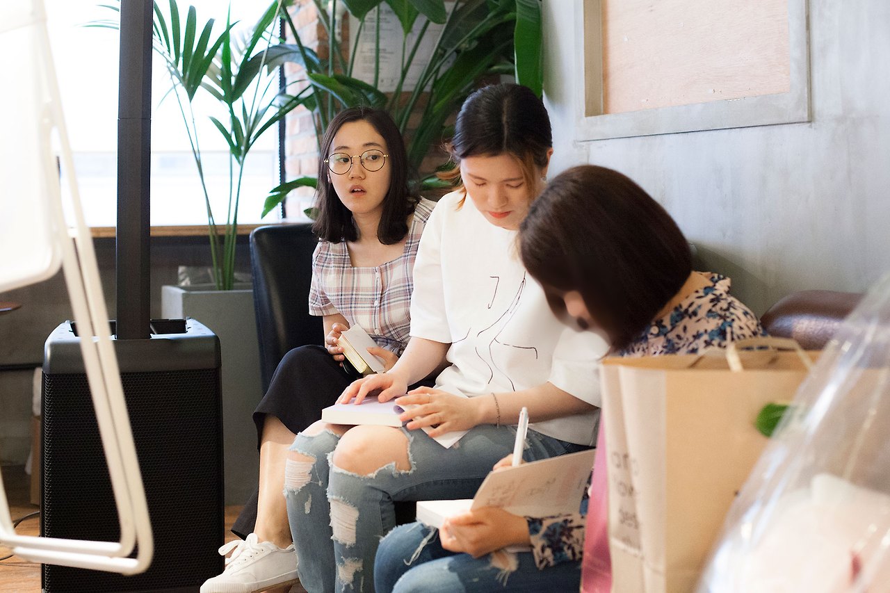 왼쪽부터 블블, 서밤 그리고 봄봄 님. 세 분께선〈 일상의 온도 〉 코너를 준비하고 계신 것 같았어요. 일상의 온도는 세 분이 감명 깊게 읽으셨던 책 또는 문화생활을 소개하는 코너에요. 초점이 맞은 분은 블블 님이에요. 블블 님은 좋은 글을 쓰시는 분이에요(브런치). 서늘한 마음썰 속 블블 님은 쓰시는 글처럼 조곤조곤 이야기를 정리하시고, 깊게 생각하신 후, 다음 마디를 신중하게 건네는 분이라고 느껴요. 블블 님의 이야기를 듣고 있다 보면 세속적이고 다난한 환경 속에서 자신을 꾸준히 가꿔나가시는 과정이, 삶의 경과가 느껴지는 것 같아서 자신을 다잡게 돼요.