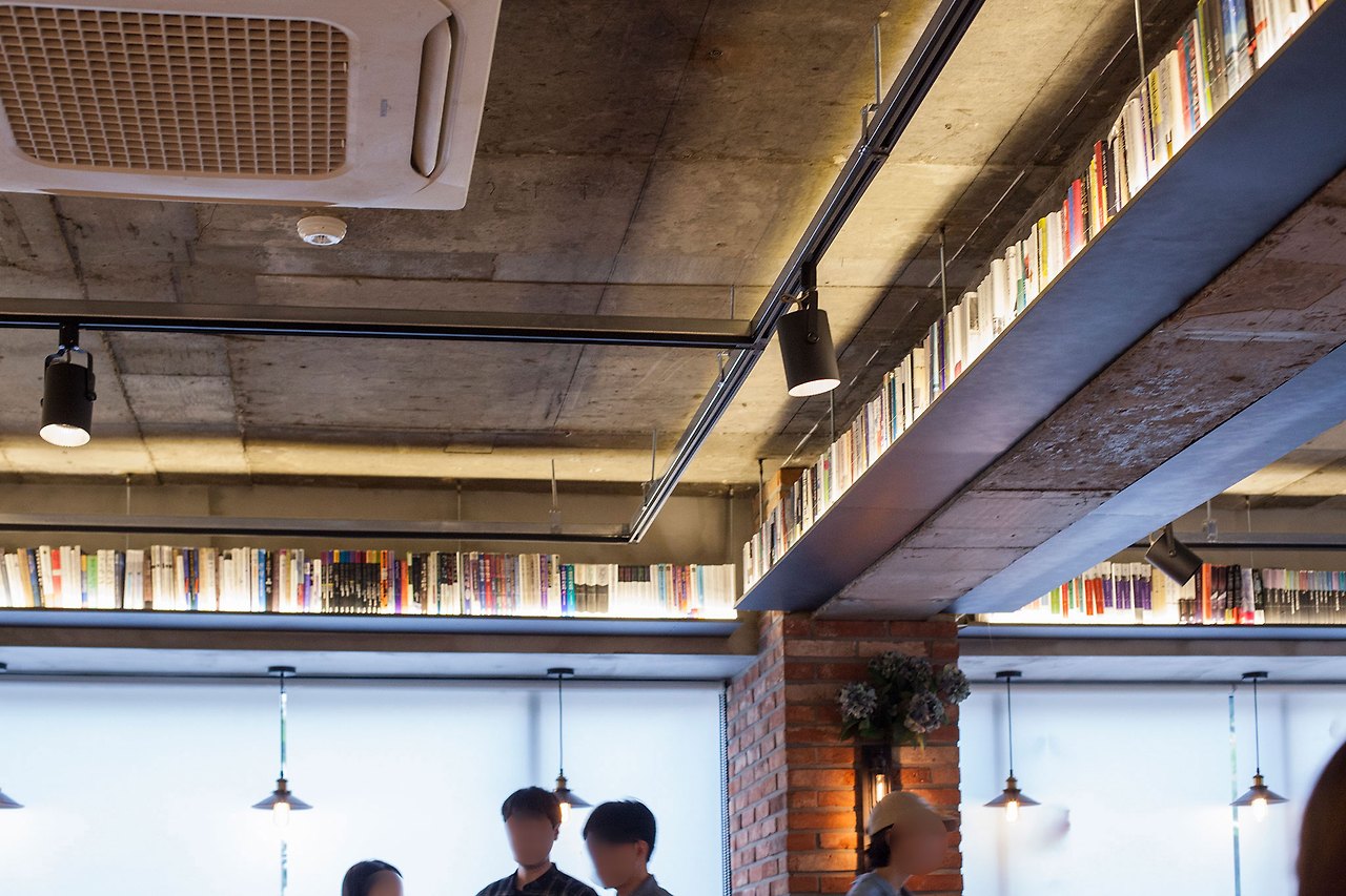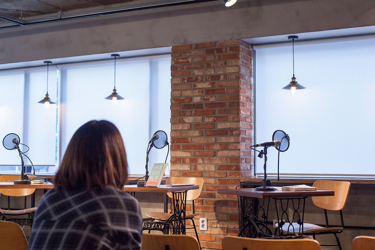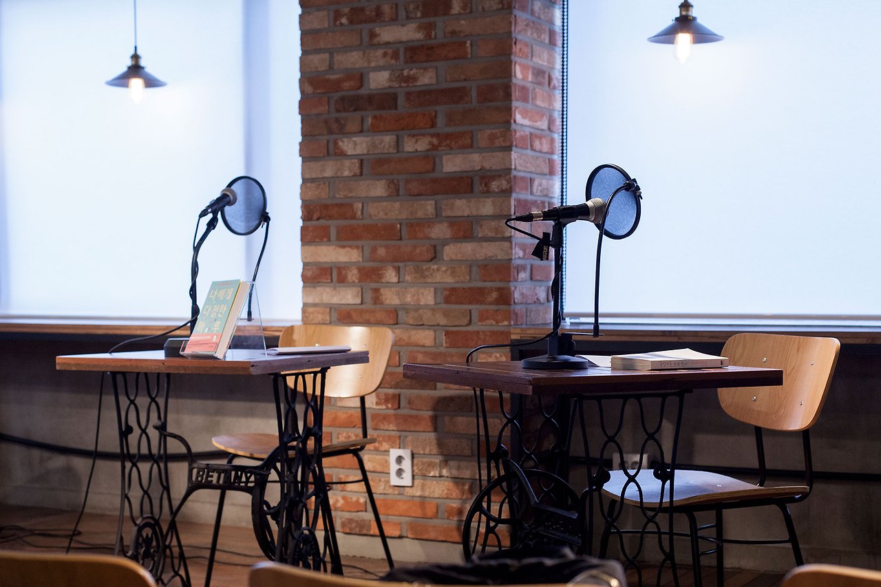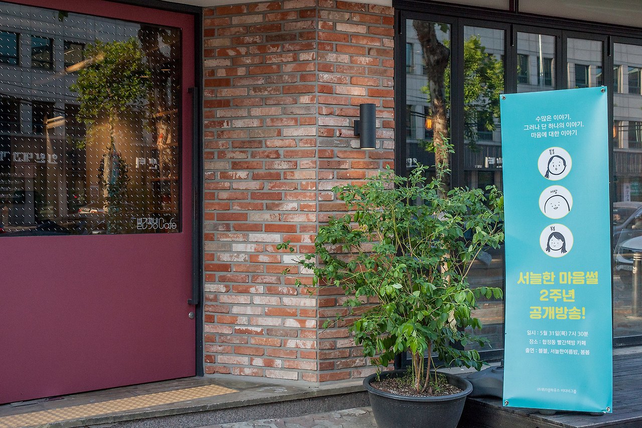 공개방송 당일, 평소보다 일찍 퇴근해서 합정동 빨간책방Cafe로 이동했어요. 빨간책방은 위즈덤하우스의 공간입니다. 일층에는 카페 겸 펍(Pub)이 있고, 2층은 강연을 할 수 있는 공간이 마련돼 있었어요. 공개방송은 2층에서 진행했습니다.