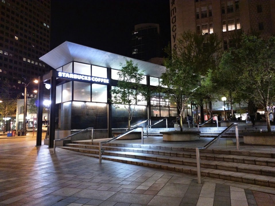 우리는 4번가와 파인스트리트 위에 있는 스타벅스에 들어갔다. 그리고 따뜻한 라테 두 잔을 시켰다. 매장 안은 비를 피해 커피를 사러 온 사람들이 많았다. 우리는 창가 쪽에 자리를 잡았다.
