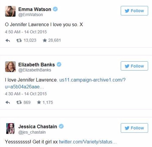 그녀의 이런 발언에 대하여 엠마 왓슨, 엘리자베스 뱅크스, 제시카 차스테인 등은 출연료 성차별에 지지하고 공감했다. 현재 그녀는 불우한 환경을 딛고 성공한 여성 CEO의 실화를 다룬 영화 <조이(2016)>의 개봉을 앞두고 있다.