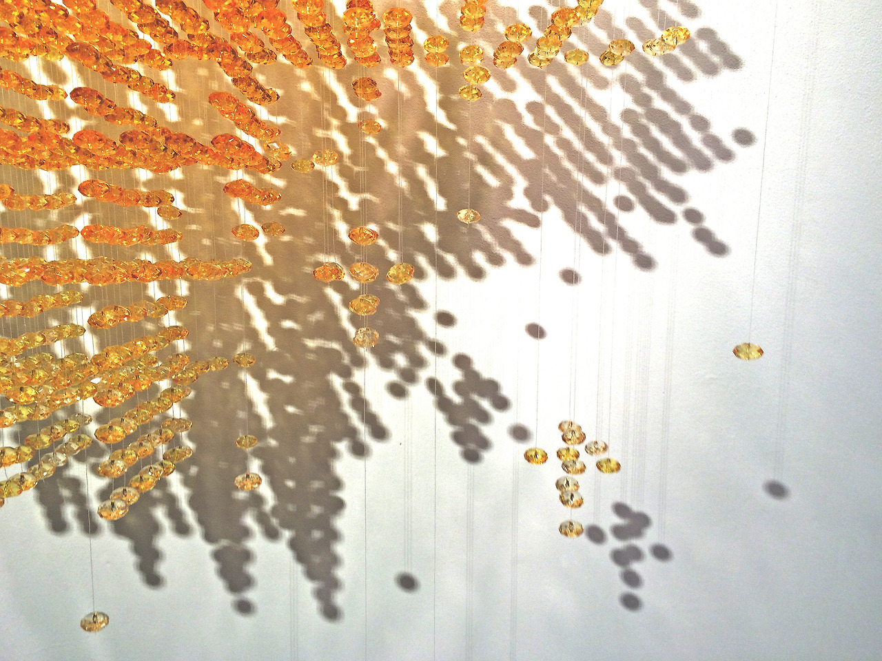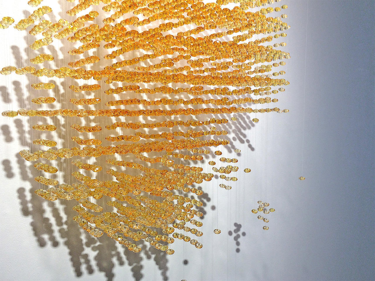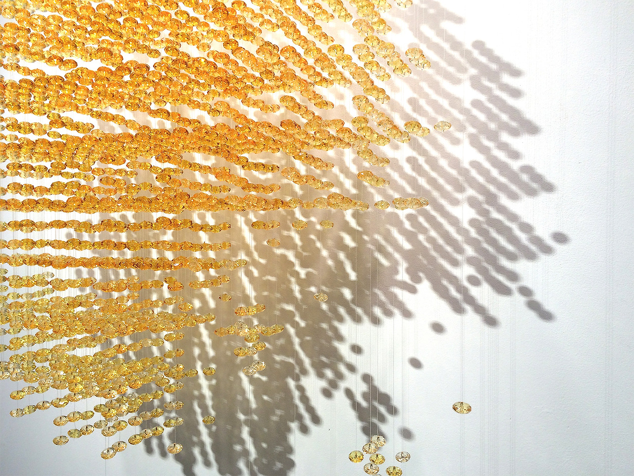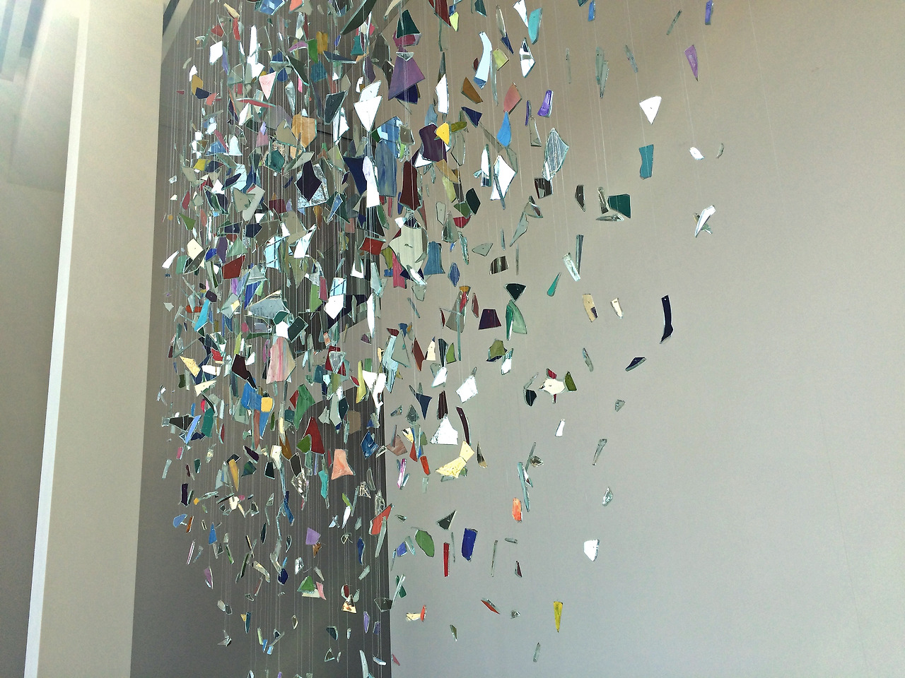 전면에 설치되어 있는 작품은 뒷면이 채색된 수많은 거울 조각으로 이루어져 있다. 이탈리아 작가 미켈란젤로 피스톨레토가 거대한 거울을 깨뜨리는 퍼포먼스를 통해 작업을 하듯, 작가는 기존의 정형화된 작업 방식에서 벗어나, 거울을 깨뜨리고, 이것의 불규칙적이면서도 정제되지 않은 파편들로 작품을 만든다. 작가는 눈에 보이지는 않으나, 실제로는 공간을 가득 채우는 공기와 바람, 그리고 유리창을 통과해 거울과 마주하는 태양광 등의 주변 요소들에 관심을 가지며, 이러한 요소들의 균형적인 조합을 통해 공간 내 찬란한 빛과 색의 향연을 선사한다.