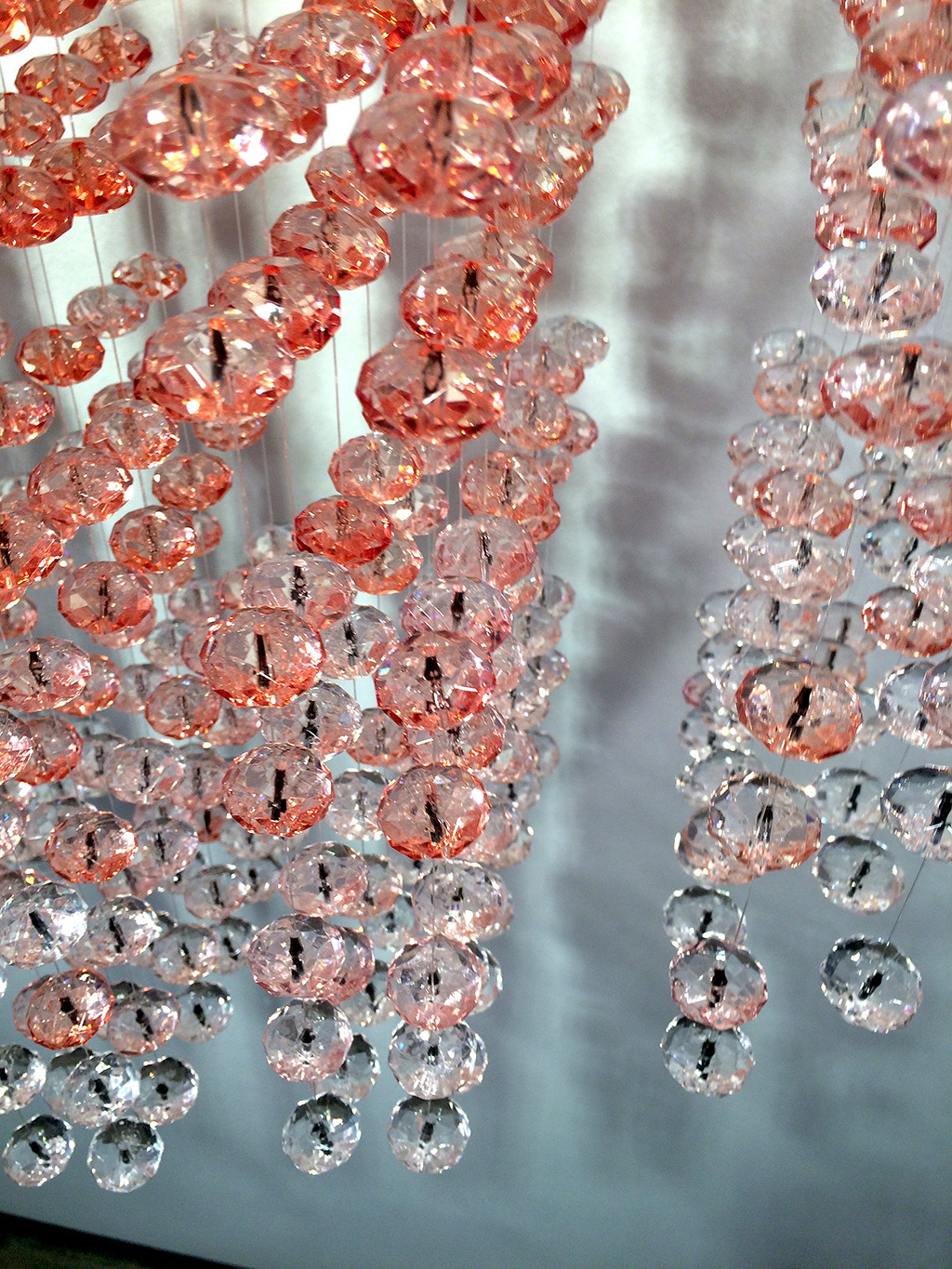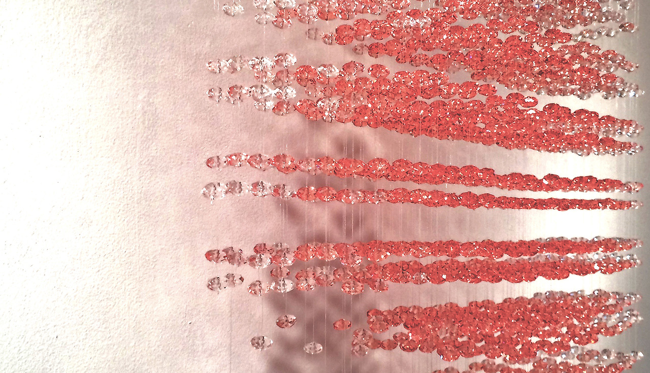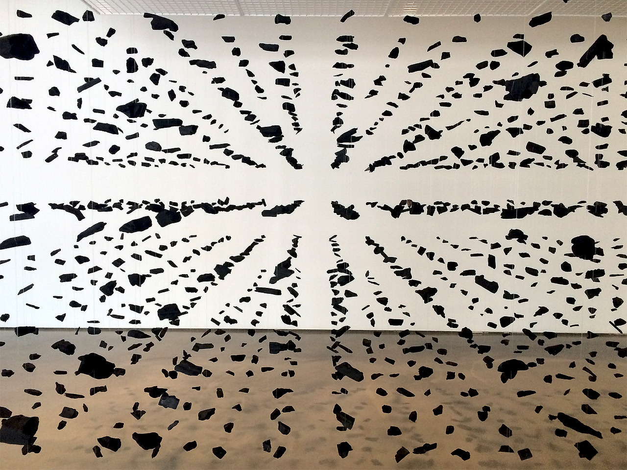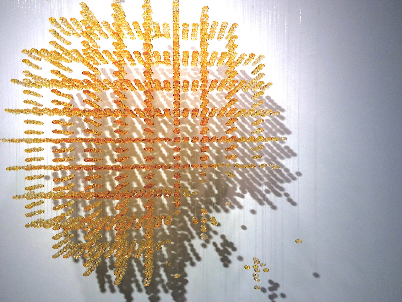 전면에 설치되어 있는 작품은 뒷면이 채색된 수많은 거울 조각으로 이루어져 있다. 이탈리아 작가 미켈란젤로 피스톨레토가 거대한 거울을 깨뜨리는 퍼포먼스를 통해 작업을 하듯, 작가는 기존의 정형화된 작업 방식에서 벗어나, 거울을 깨뜨리고, 이것의 불규칙적이면서도 정제되지 않은 파편들로 작품을 만든다. 작가는 눈에 보이지는 않으나, 실제로는 공간을 가득 채우는 공기와 바람, 그리고 유리창을 통과해 거울과 마주하는 태양광 등의 주변 요소들에 관심을 가지며, 이러한 요소들의 균형적인 조합을 통해 공간 내 찬란한 빛과 색의 향연을 선사한다.