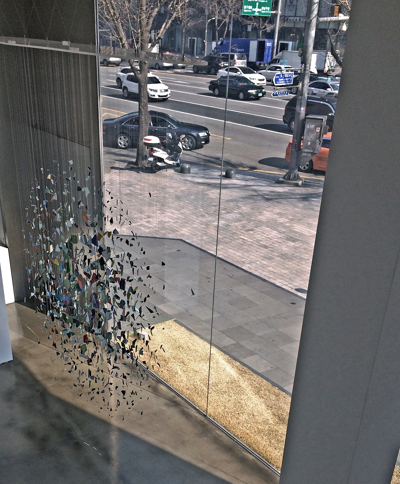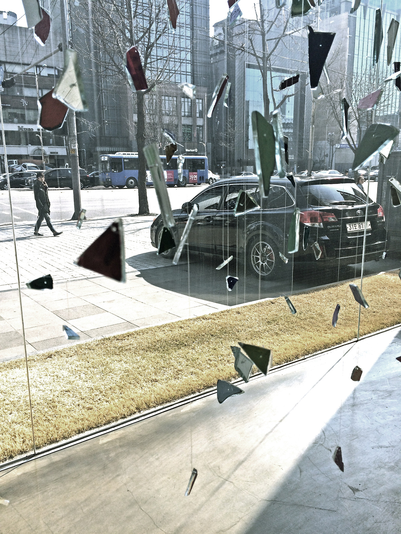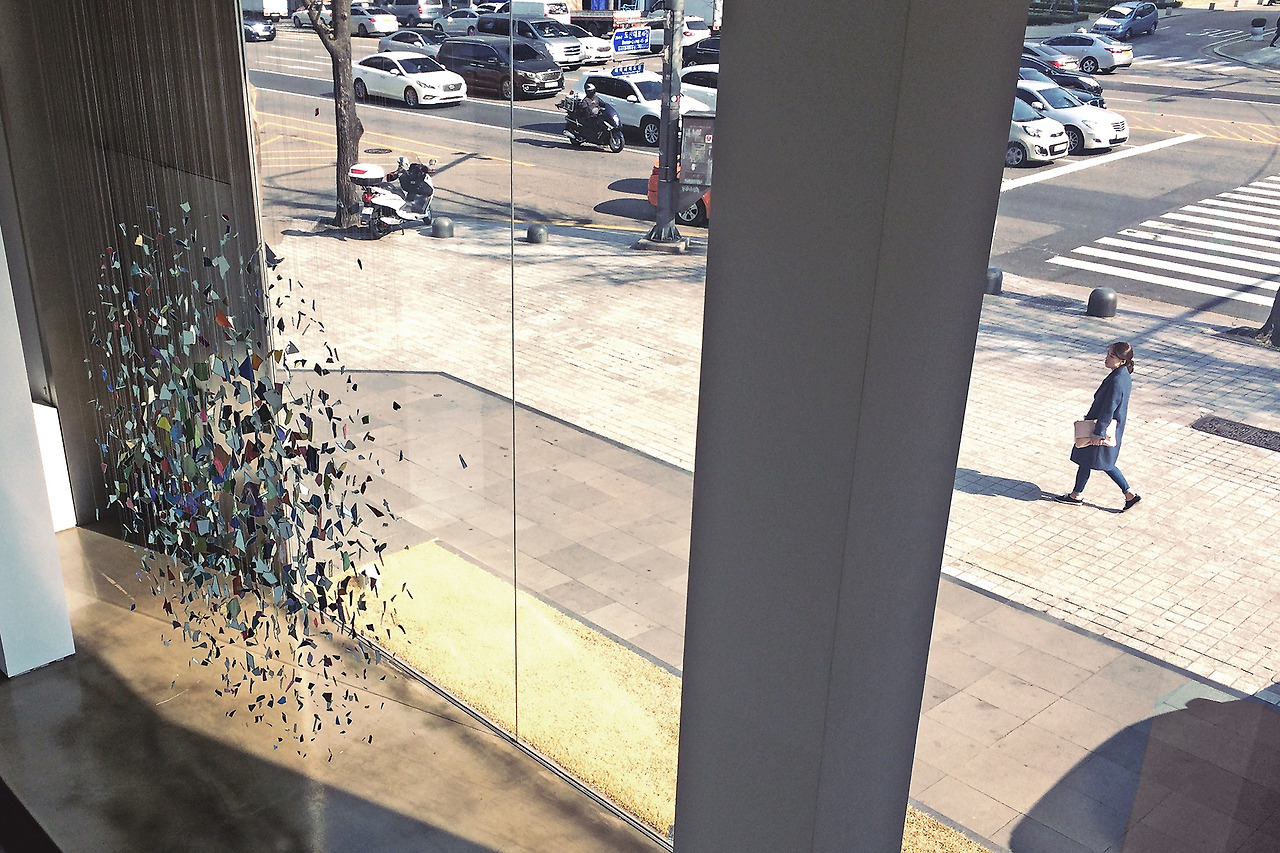 작품은 그 자체로서의 의미보다 감상자와 바깥 풍경과 함께 완성된다. 깨어진 색 조각 사이로 비치는 바깥 모습과 본인의 모습은 번갈아가면서 차원을 축소 / 확장하며 감상자와 소통한다.