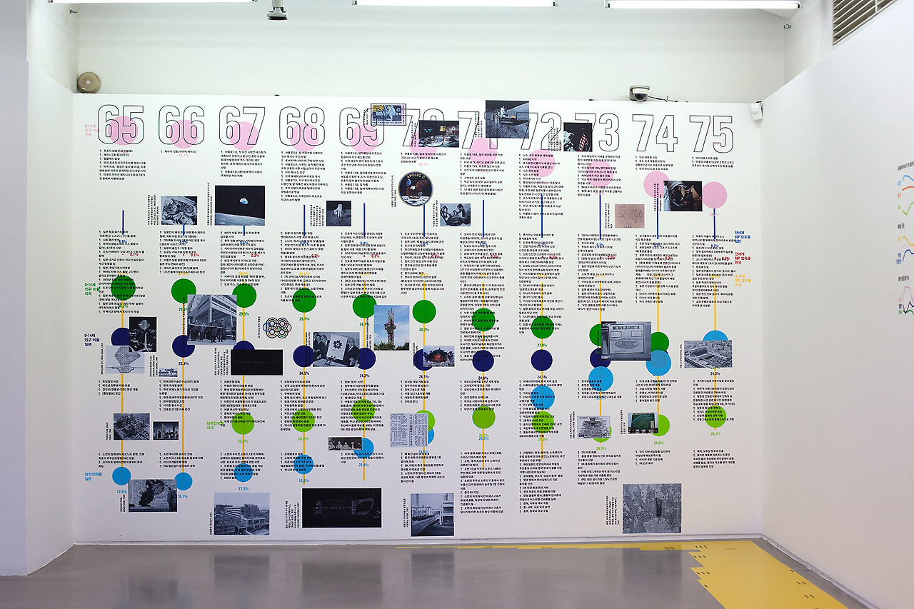 <옵티컬 레이스>는 1965년부터 2015년까지 이어지는 통계 자료를 취합하고 세월이 흐르면서 가시적으로 드러나는 사회의 면모들을 취합한다. 작가는 65-75년, 85-95년, 05-15년까지 세 구획으로 시대를 구분한다. 그리고는 세 구획을 관통하는 통계자료를 엮음으로써 변화하는 사회의 흐름과 그 속에 있는 작가들의 생애(바닥에 위치한 노란색 시트지)를 이산(離散, discrete)적으로 드러낸다.