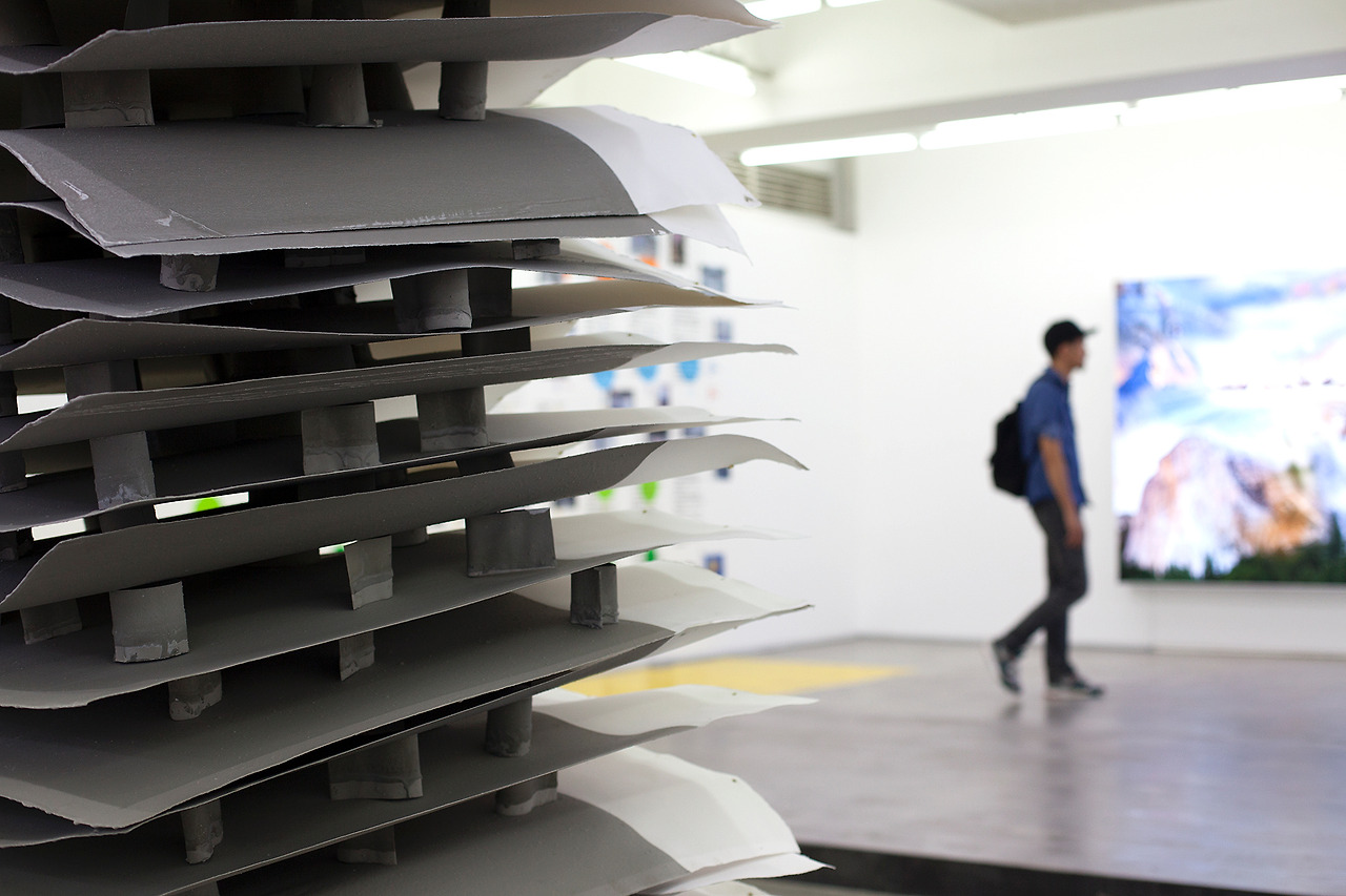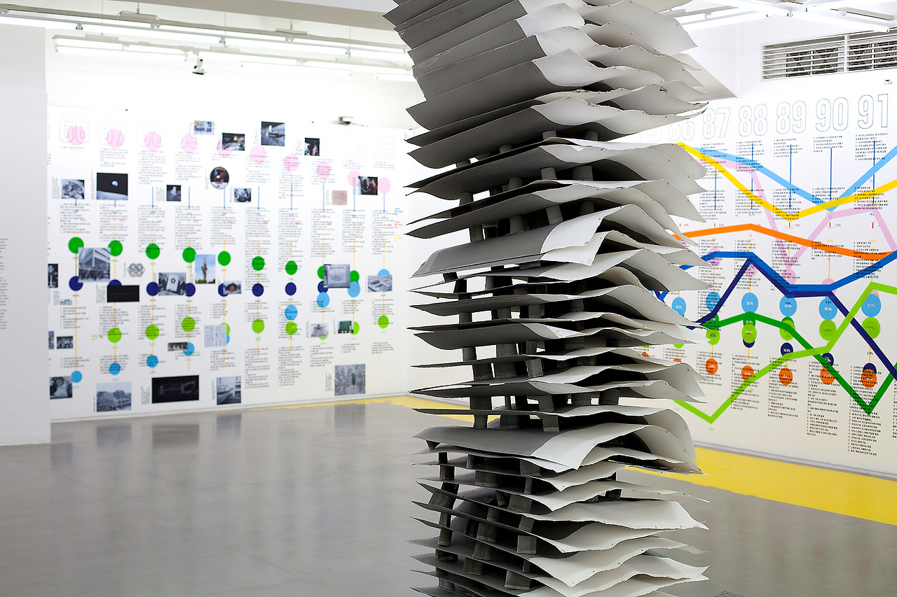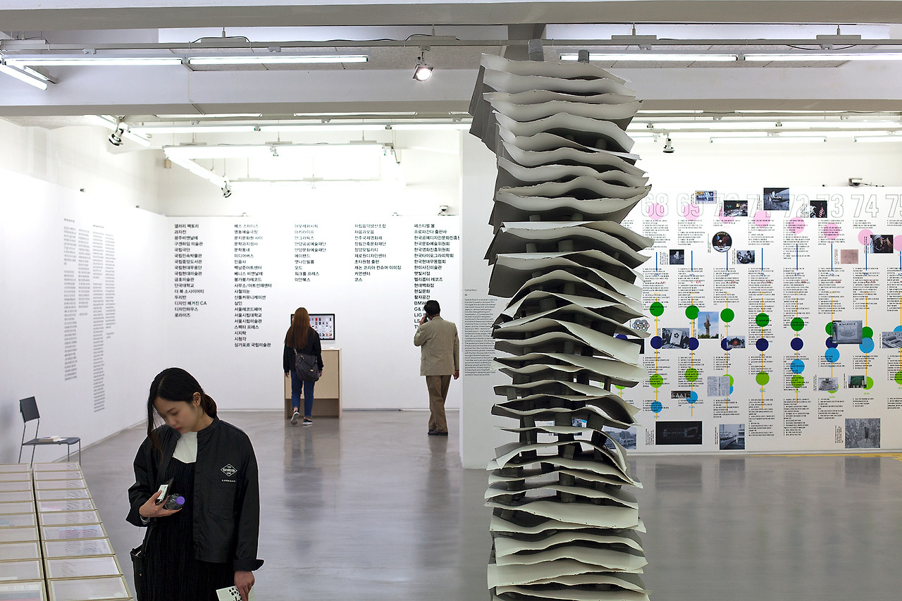 구불거리고 비정형적인 종이가 쌓여 하나의 기둥을 이루고, 그것이 전시실 전체를 꿰고 있음은 다양한 영역에서 활동하고 있는 예술가들의 정수를 본질적으로 형상한 다. 그래픽 디자이너가 누구인가에 대한 작가(설계회사, SGHS)의 대답이다.