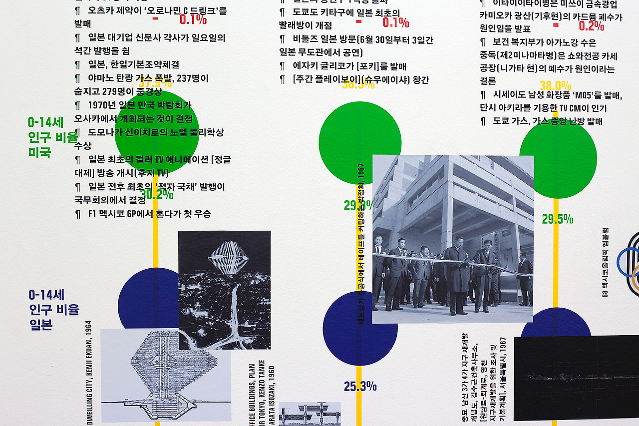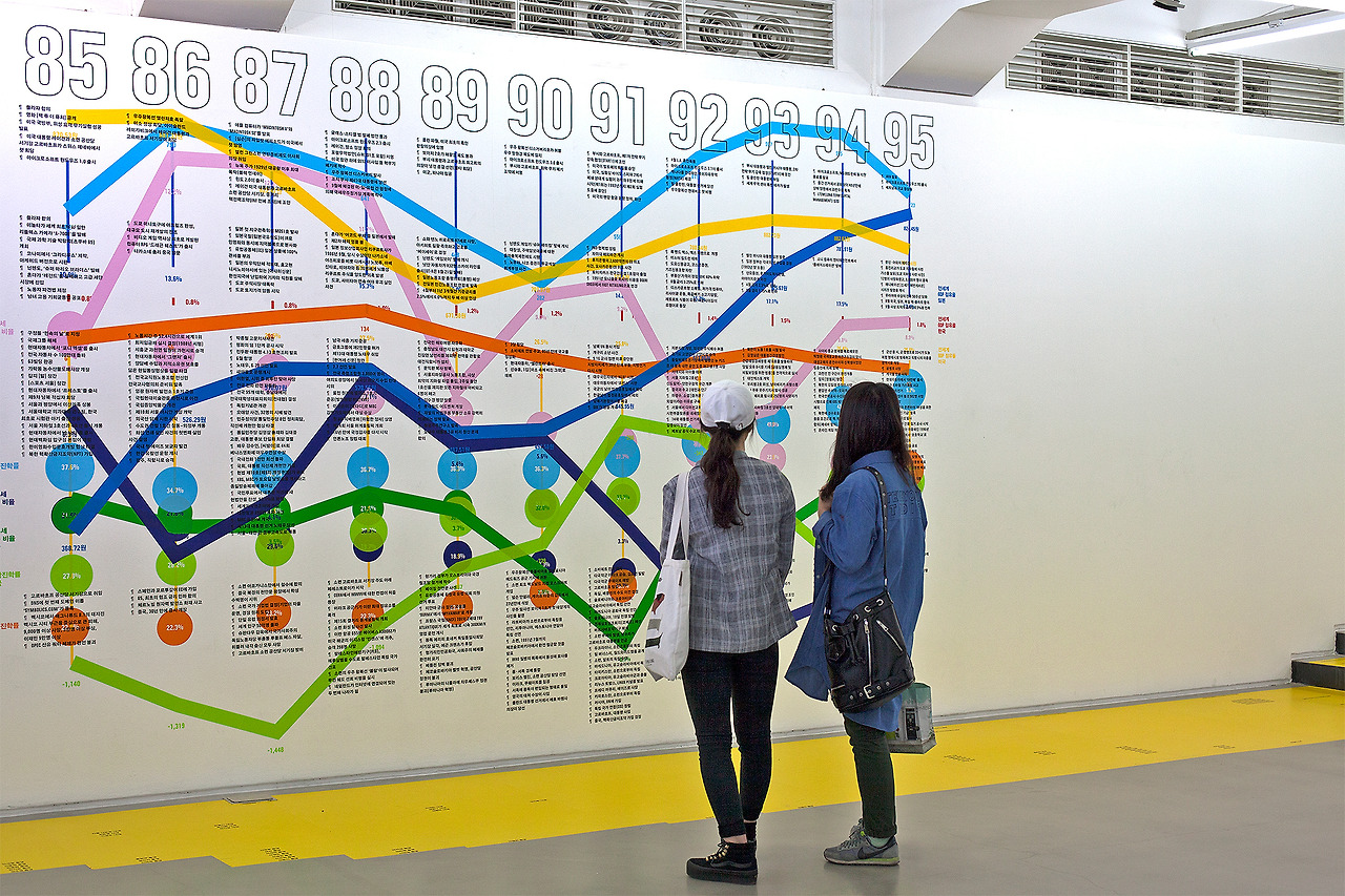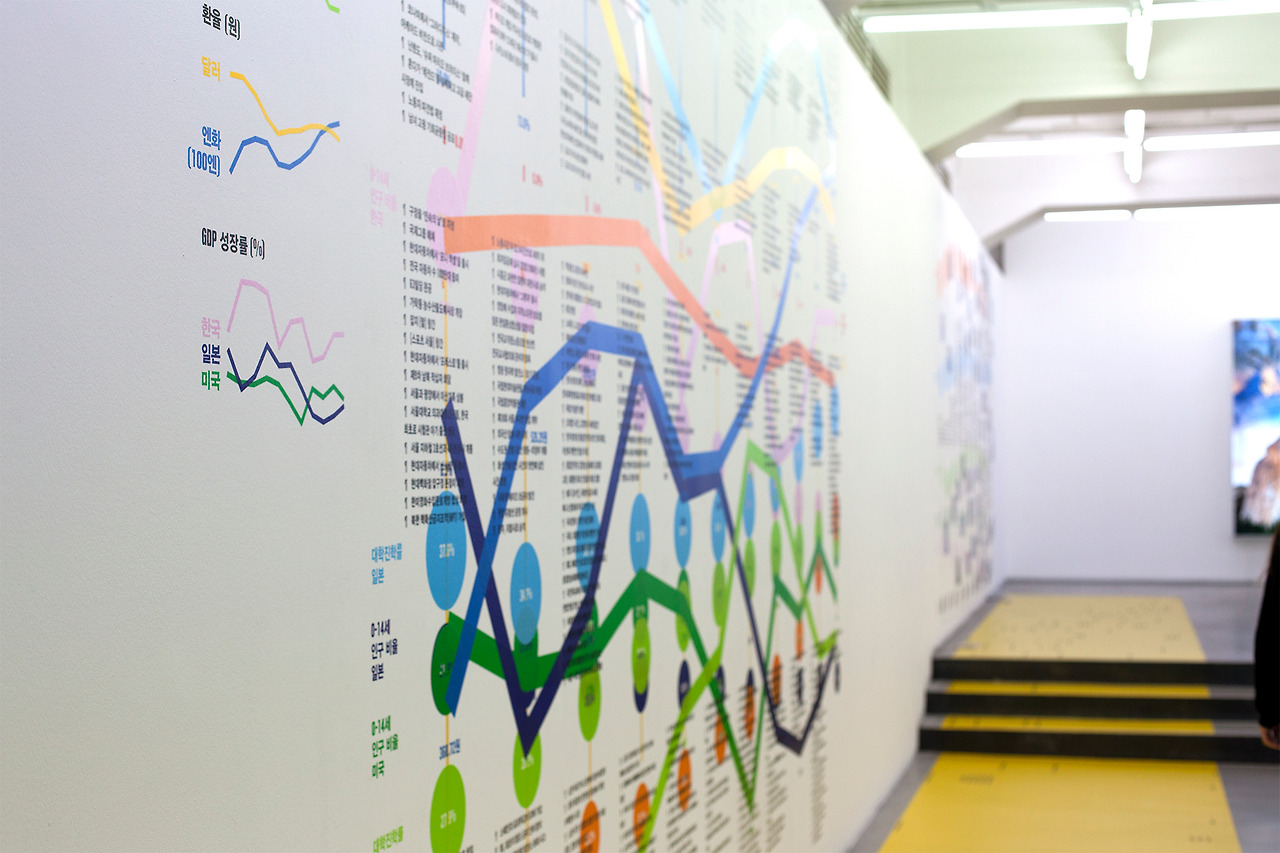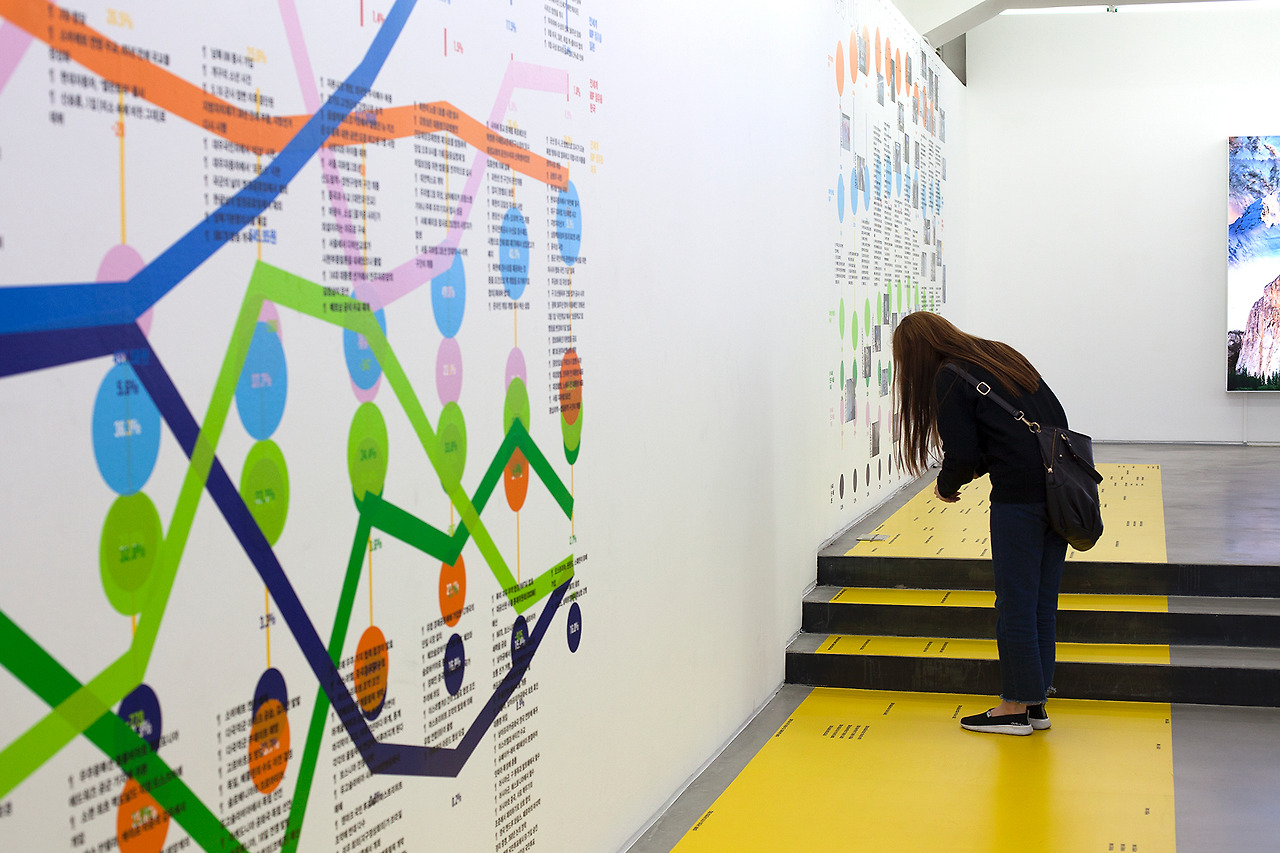 전시실 바로 왼쪽 벽면엔 <옵티컬 레이스>가 있다. 옵티컬 레이스는 그래픽 디자이너 김형재와 건축을 전공한 박재현을 중심으로 활동하는 창작 집단이다. 본 작품은 두 사람이 통계나 사료 등을 수집하고 시각화하는 작업을 전시한다.