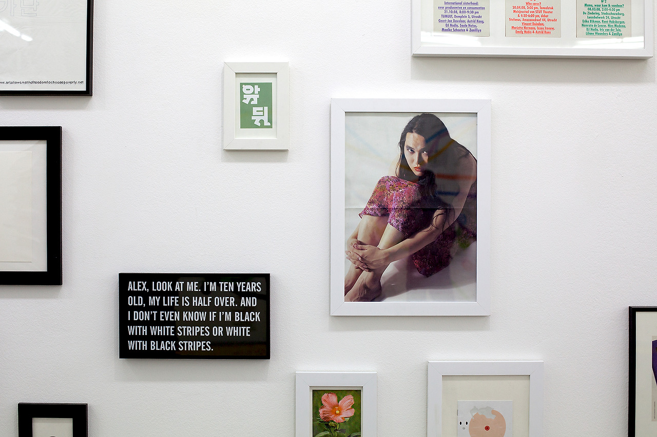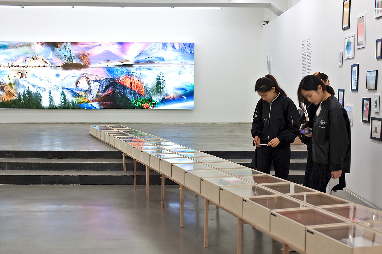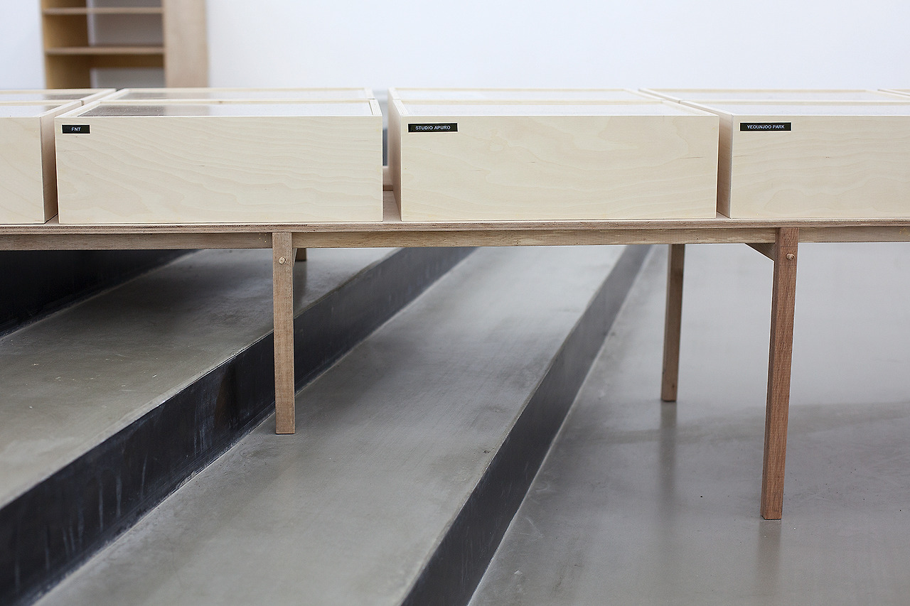 이제 전시실 오른편으로 돌아보자. 1층 전시실을 대각선으로 관통하는 나무 상자의 묶음과 액자가 보인다. 더 북 소사이어티, 테이블 유니온, COM이 공동으로 기획한 작품, <불완전한 리스트>다.