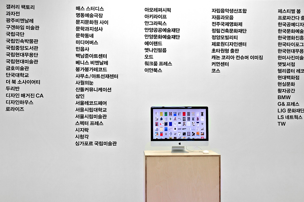 목적성이 뚜렷하고, 예술적이면서도 설득적인 방법으로 주제를 드러내야 하기 때문이다. 이렇게 섞일 수 없는 주제와 개성을 가진 작품들이지만 <그래픽 디자인> 전시는 이러한 속성 때문에 집합 그 자체로 주제 의식을 표현할 수 있다. 이것은 역설적이고도 분열적인 입장이다. <불완전한 리스트>의 요소들이 각 주제에 충실할 수록 그 군집(리스트)은 산만해진다. 그러나 이것들을 관통하는 주제의식은 오히려 점점 더 또렷해진다. 세포들(불완전한 리스트의 요소)의 개성이 넘쳐날 수록, <불완전한 리스트>라는 유기체는 점점 더 생기를 띈다. 작품들이 '주제의식'으로 모인 것이 아니라 '그래픽 디자이너의 정신'에 초점이 맞아 있기 때문이다.