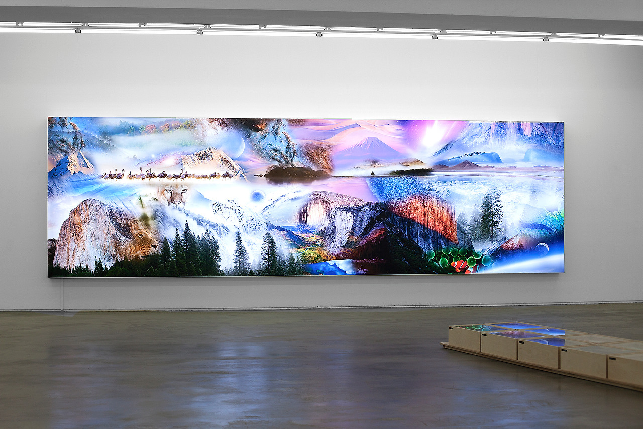 작품은 180 by 600 cm의 큰 크기의 작품이다. 처음에는 이미지를 대강 배치하고 브러시로 슥슥 지워낸 듯 하지만 자세히 보면 작품은 배경화면 간의 색 경계를 생각하고 조화롭게 화면을 구성했다. 왼쪽 하단, '요세미티'의 갈색 바위를 끝으로 '마운틴 라이언'의 갈기가 시작되고, 보랏빛 후지산 배경화면이 요세미티의 보라색 석양, 오로라의 보랏빛 발색과 이어지는 것이 그렇다.