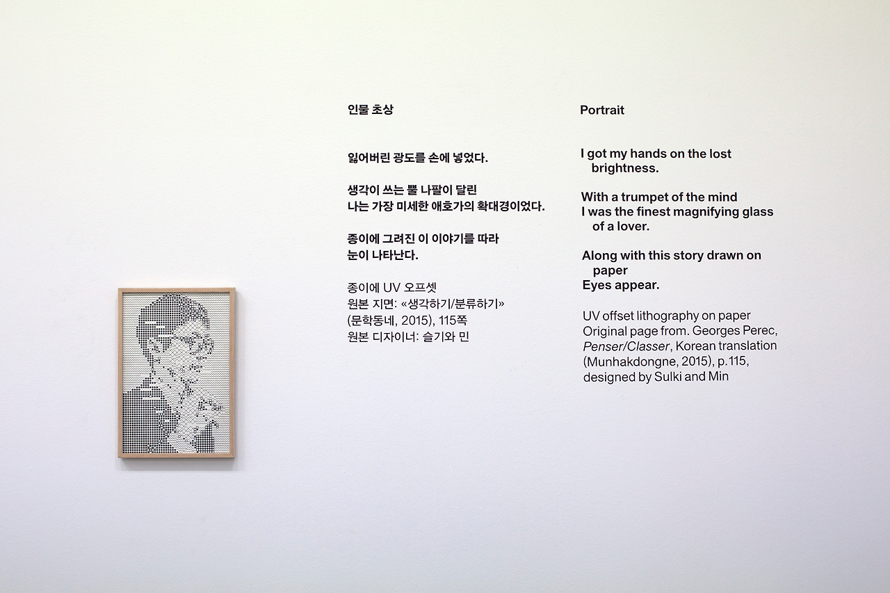 <인물 초상>의 시구(오른쪽)는 왼쪽 작품의 구멍이 된다. 남은 글자는 새로운 그래픽 디자인으로 재활용된다. 잠재문학실험실의 그래픽 디자인은 재활용이라기보다는 변용(變容, 용모를 바꿔 씀)이다.