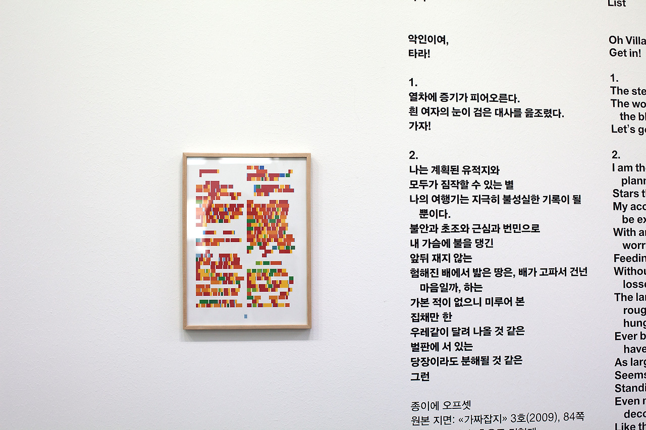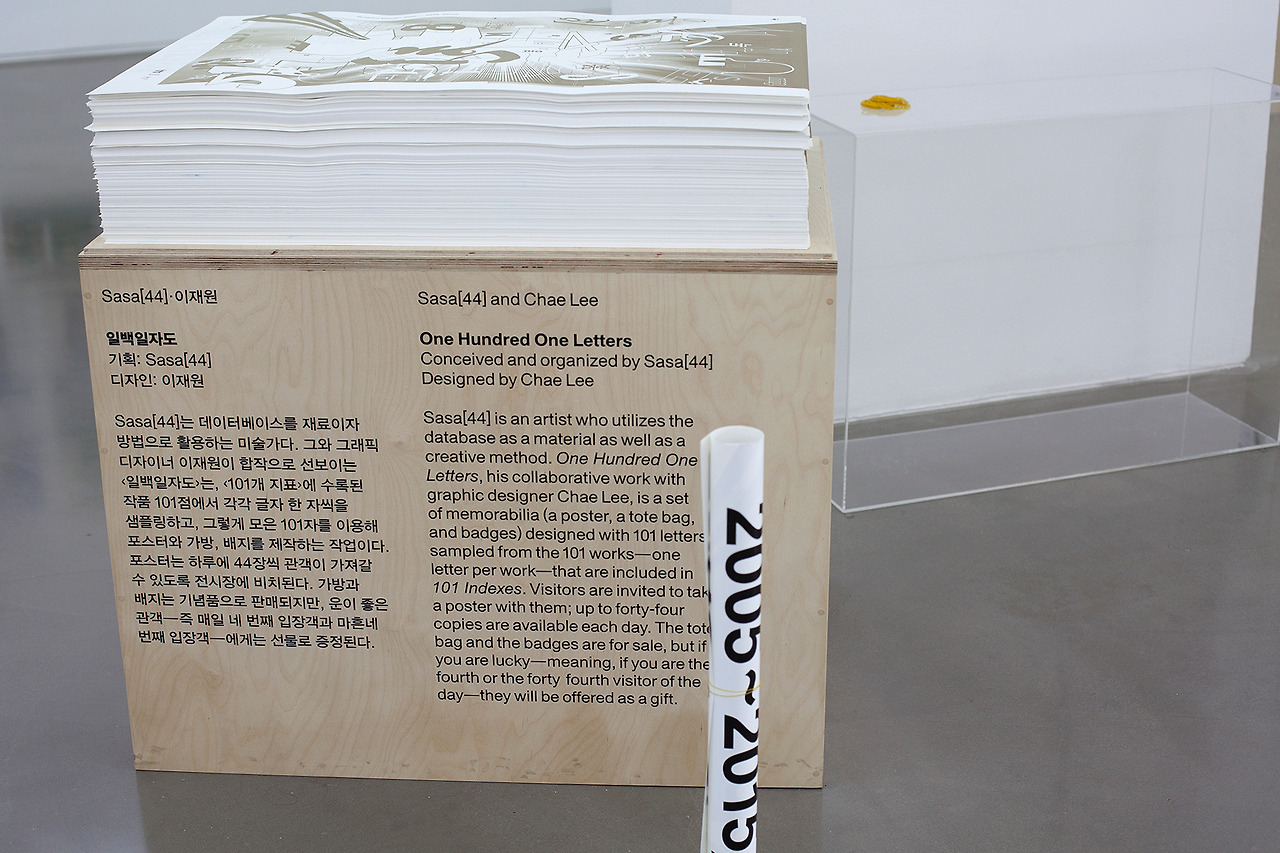 Sasa와 이재원 작가의 <일백일자도One Hundred One Letters>는 <101개의 지표>에 수록된 작품 101점에서 각각 글자 한 자 씩을 샘플링하고, 그렇게 모은 101자를 이용해 포스터와 가방 배지를 제작한다. 포스터는 하루에 44장씩 관객이 가져갈 수 있도록 비치된다. 필자의 경우 11번째 넘버링이 적힌 포스터를 손에 넣었다. <일백일자도>는 미술관을 일찍 방문한 사람들이 가져갈 수 있는 일종의 '수혜'다.