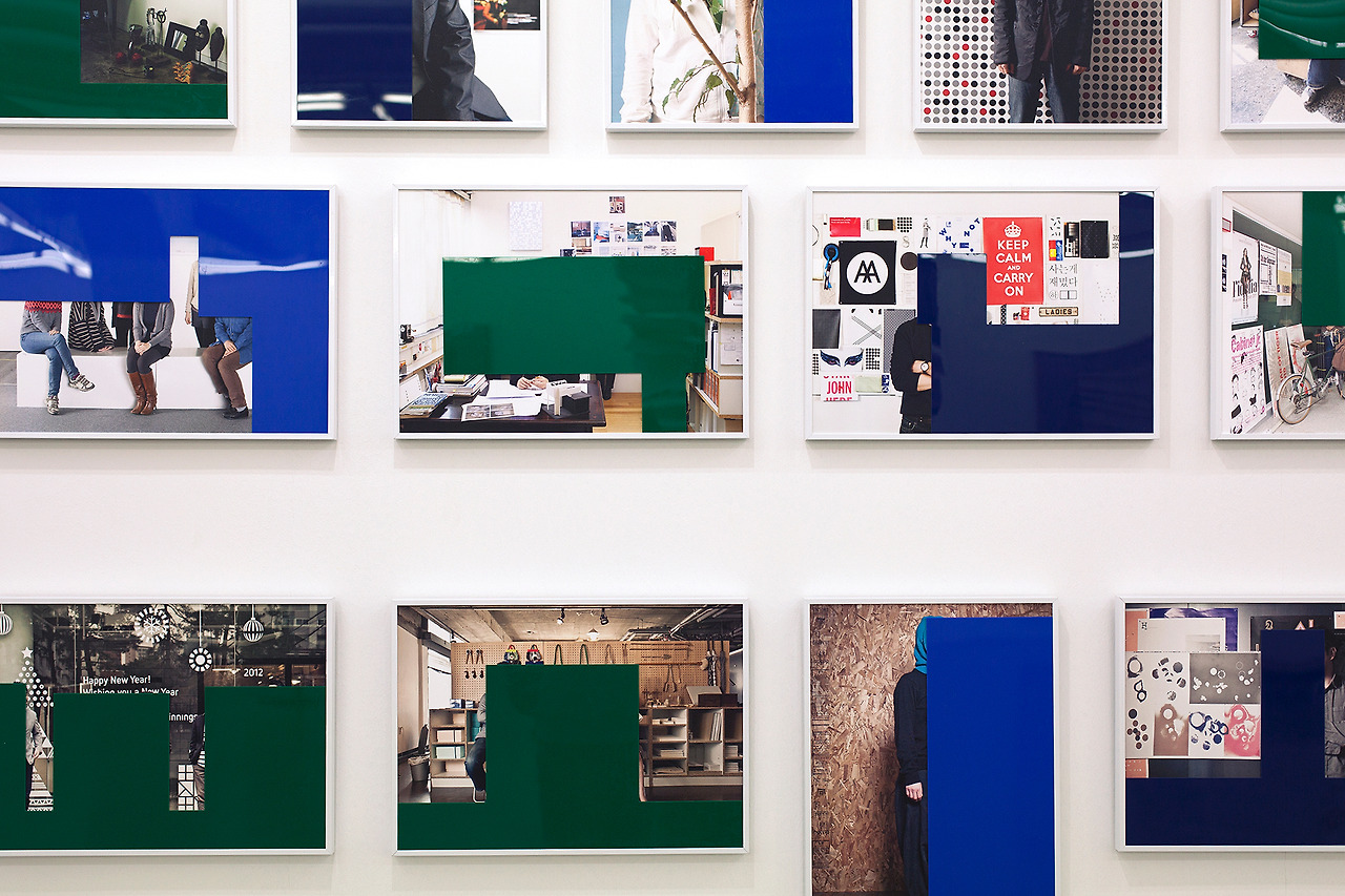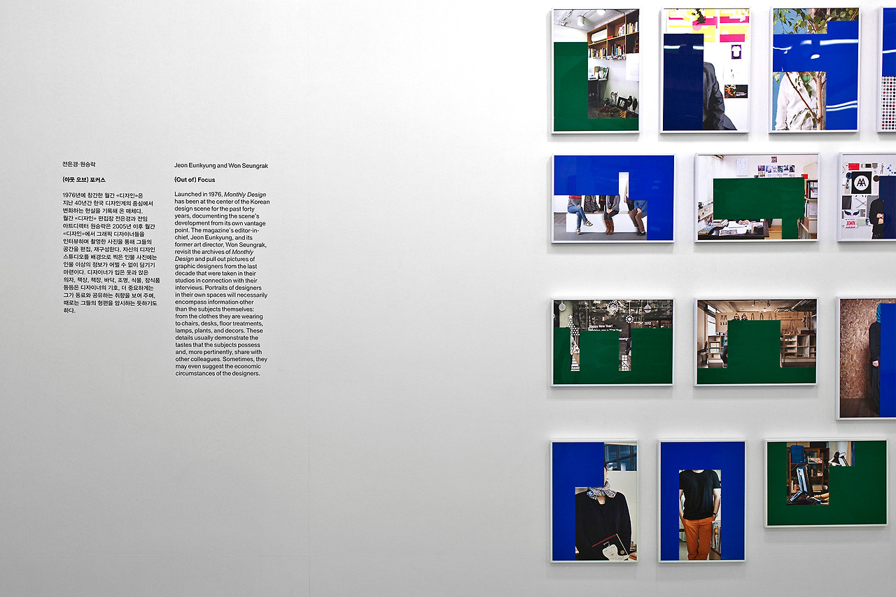 오른쪽 벽으로 눈을 돌리자. 전은경과 원승락 작가의 <아웃 오브 포커스>가 보인다. 둘은 월간 <디자인>에서 함께 일했다. 이 작품은 월간 <디자인>에 등장했던 그래픽 디자이너들 사진을 편집하고 재구성한 작품이다. 본 작품에서 작가들의 얼굴은 모두 가려져 있다. 전은경과 원승락은 자신의 작품을 이렇게 설명한다.