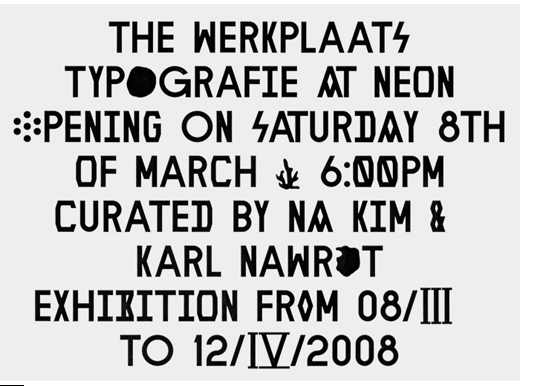 김영나가 재구성한 오틱 노이어라는 폰트는 일종의 폰트 우상(FONT-IDOL)의 의미, 즉 의인화된 폰트로 해석할 수 있겠습니다. 이 서체는 기본적으로는 김영나 씨가 만든 것이 아니에요. 이것은 동료 일러스터이자 디자이너인 칼 나브로(KARL NAWROT)씨가 디자인한 오틱 노이어(OTIK NEUE)입니다. 그렇지만 김영나 씨가 일부 알파벳을 유사한 형태의 약물로 교체했으니 정확하게 이름을 새로 붙인다면, '재구성된 오틱 노이어'라고 부를 수 있겠습니다.