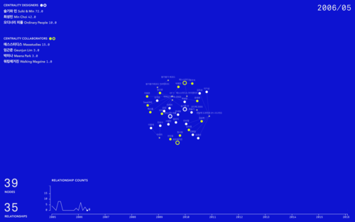 이 작업은 여러 디자이너의 연결 관계를 조감하는 네트워크 지도와 그것을 바탕으로 디자이너 커뮤니티를 시뮬레이션해 주는 애플리케이션으로 구성된다.